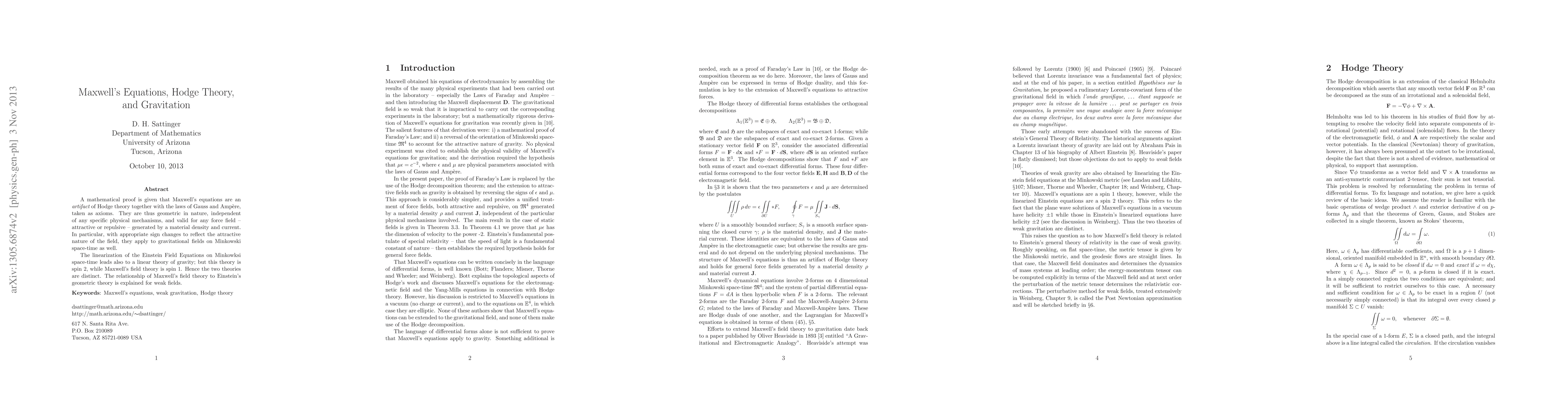 A mathematical proof is given that Maxwell's equations are an {\it artifact} of Hodge theory together with the laws of Gauss and Amp\`ere, taken as axioms. They are thus geometric in nature, independent of any specific physical mechanisms, and valid for any force field -- attractive or repulsive -- generated by a material density and current. In particular, with appropriate sign changes to reflect the attractive nature of the field, they apply to gravitational fields on Minkowski space-time as well. The linearization of the Einstein Field Equations on Minkowksi space-time leads also to a linear theory of gravity; but this theory is spin 2, while Maxwell's field theory is spin 1. Hence the two theories are distinct. The relationship of Maxwell's field theory to Einstein's geometric theory is explained for weak fields.