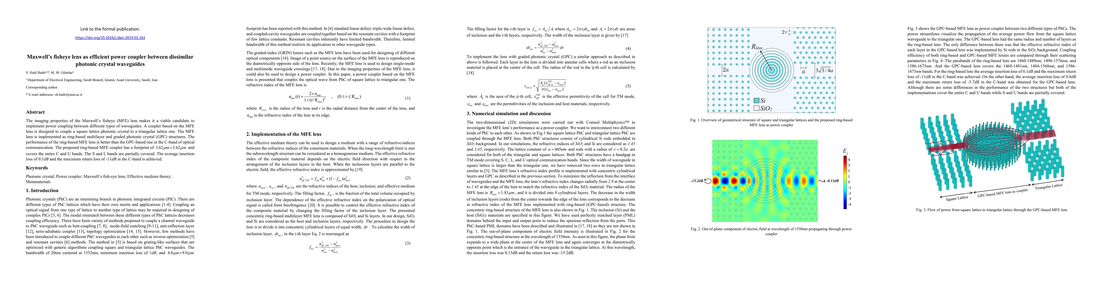 The paper proposes a Maxwell's fisheye lens-based coupler for efficient power transfer between square and triangular lattice photonic crystal waveguides. The ring-based multilayer design outperforms the graded photonic crystal structure, achieving an average insertion loss of 0.1dB and a maximum return loss of -11dB in the C-band.