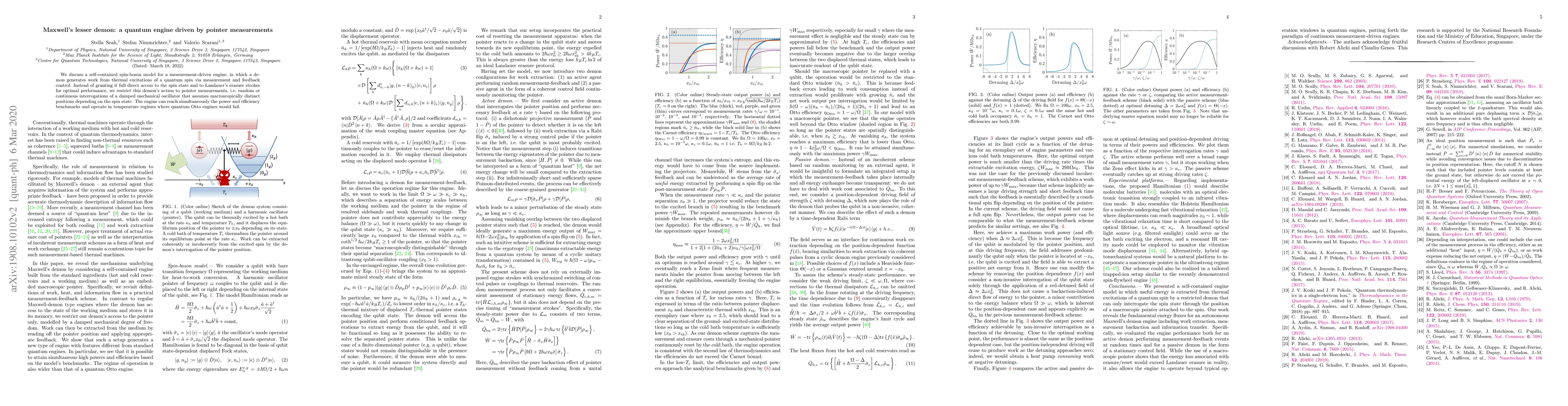 We discuss a self-contained spin-boson model for a measurement-driven engine, in which a demon generates work from thermal excitations of a quantum spin via measurement and feedback control. Instead of granting it full direct access to the spin state and to Landauer's erasure strokes for optimal performance, we restrict this demon's action to pointer measurements, i.e. random or continuous interrogations of a damped mechanical oscillator that assumes macroscopically distinct positions depending on the spin state. The engine can reach simultaneously the power and efficiency benchmarks and operate in temperature regimes where quantum Otto engines would fail.