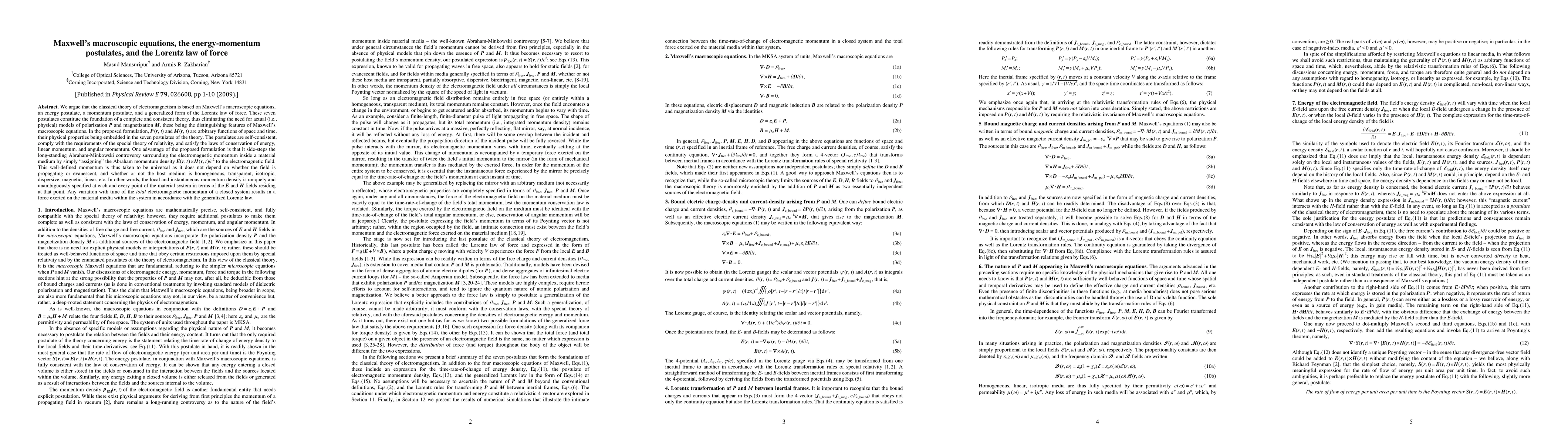 We argue that the classical theory of electromagnetism is based on Maxwell's macroscopic equations, an energy postulate, a momentum postulate, and a generalized form of the Lorentz law of force. These seven postulates constitute the foundation of a complete and consistent theory, thus eliminating the need for actual (i.e., physical) models of polarization P and magnetization M, these being the distinguishing features of Maxwell's macroscopic equations. In the proposed formulation, P(r,t) and M(r,t) are arbitrary functions of space and time, their physical properties being embedded in the seven postulates of the theory. The postulates are self-consistent, comply with the requirements of the special theory of relativity, and satisfy the laws of conservation of energy, linear momentum, and angular momentum. One advantage of the proposed formulation is that it side-steps the long-standing Abraham-Minkowski controversy surrounding the electromagnetic momentum inside a material medium by simply "assigning" the Abraham momentum density E(r,t) x H(r,t)/c^2 to the electromagnetic field. This well-defined momentum is thus taken to be universal as it does not depend on whether the field is propagating or evanescent, and whether or not the host medium is homogeneous, transparent, isotropic, dispersive, magnetic, linear, etc. In other words, the local and instantaneous momentum density is uniquely and unambiguously specified at each and every point of the material system in terms of the E and H fields residing at that point. Any variation with time of the total electromagnetic momentum of a closed system results in a force exerted on the material media within the system in accordance with the generalized Lorentz law.
