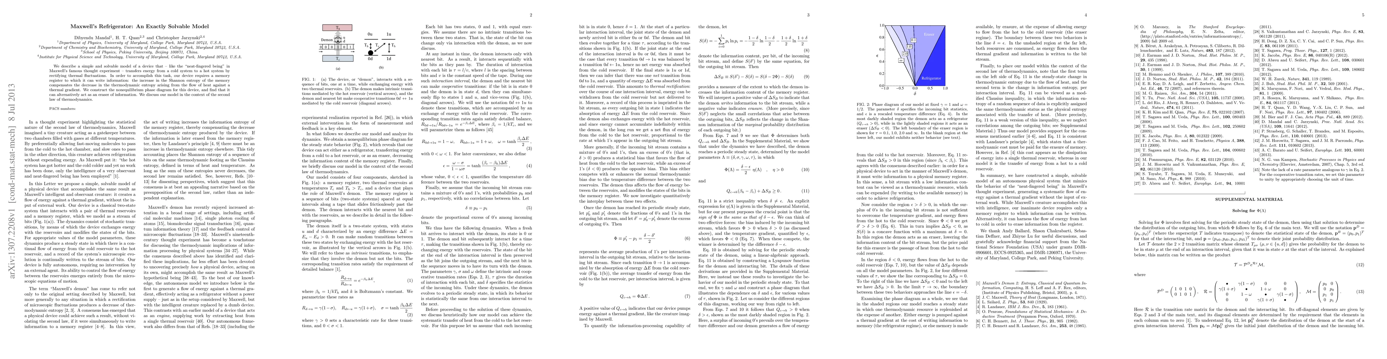 This paper presents a solvable model of Maxwell's refrigerator, which transfers energy from a cold to a hot system using thermal fluctuations and a memory register. The model reveals the device's dual role as both a refrigerator and an information eraser, challenging traditional thermodynamic laws.
