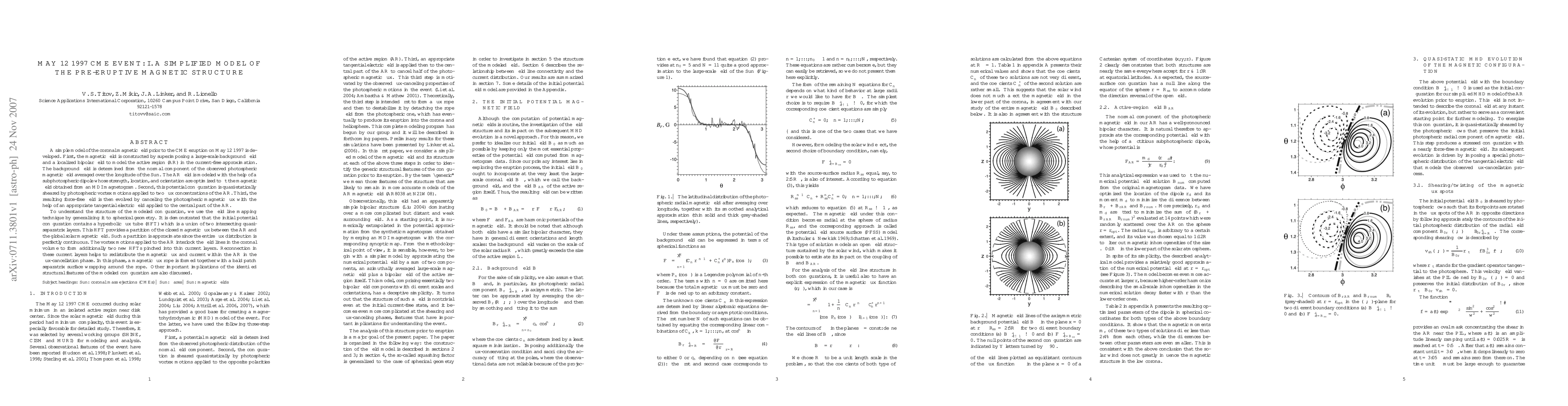 A simple model of the coronal magnetic field prior to the CME eruption on May 12 1997 is developed. First, the magnetic field is constructed by superimposing a large-scale background field and a localized bipolar field to model the active region (AR) in the current-free approximation. Second, this potential configuration is quasi-statically sheared by photospheric vortex motions applied to two flux concentrations of the AR. Third, the resulting force-free field is then evolved by canceling the photospheric magnetic flux with the help of an appropriate tangential electric field applied to the central part of the AR. To understand the structure of the modeled configuration, we use the field line mapping technique by generalizing it to spherical geometry. It is demonstrated that the initial potential configuration contains a hyperbolic flux tube (HFT) which is a union of two intersecting quasi-separatrix layers. This HFT provides a partition of the closed magnetic flux between the AR and the global solar magnetic field. The vortex motions applied to the AR interlock the field lines in the coronal volume to form additionally two new HFTs pinched into thin current layers. Reconnection in these current layers helps to redistribute the magnetic flux and current within the AR in the flux-cancellation phase. In this phase, a magnetic flux rope is formed together with a bald patch separatrix surface wrapping around the rope. Other important implications of the identified structural features of the modeled configuration are also discussed.