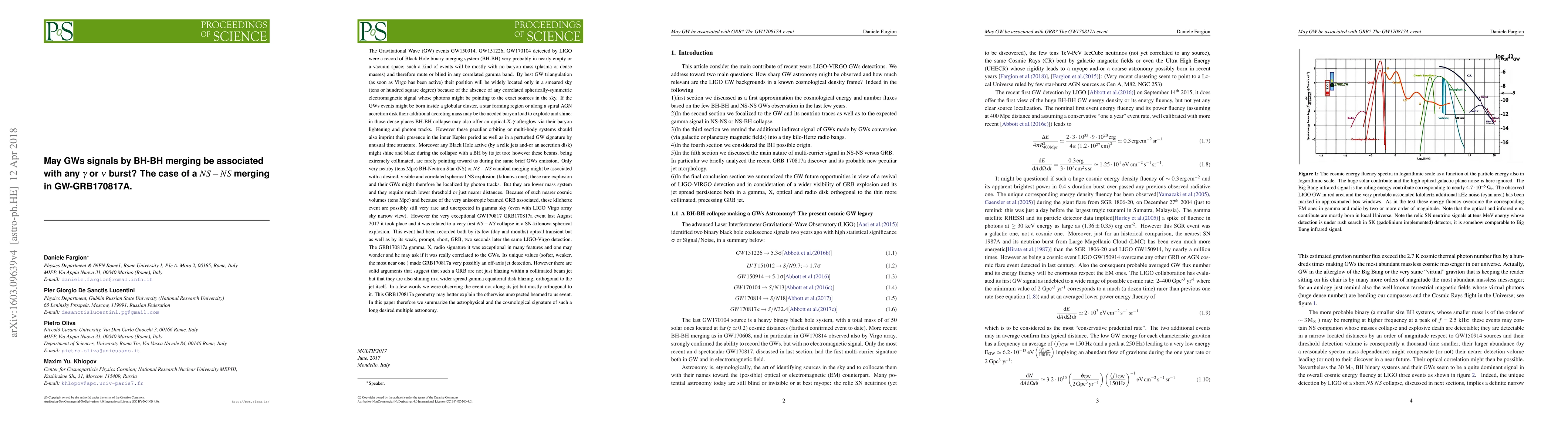 The Gravitational Wave (GW) events GW150914, GW151226, GW170104 detected by LIGO were a record of Black Hole binary merging system (BH-BH) very probably in nearly empty or a vacuum space; such a kind of events will be mostly with no baryon mass (plasma or dense masses) and therefore mute or blind in any correlated gamma band. If the GWs events might be born inside a globular cluster, a star forming region or along a spiral AGN accretion disk their additional accreting mass may be the needed baryon load to explode and shine: in those dense places. BH BH collapse may also offer an optical X and gamma afterglow via their baryon lightening and photon tracks. Only very nearby (tens Mpc) BH Neutron Star (NS) or NS NS cannibal merging might be guaranteed and associated also with a desired, visible and correlated spherical NS explosion (kilonova one); they require much lower threshold or just nearer distances. Indeed such a very exceptional GW170817 GRB170817a event occurred last August 2017; it took place and it was related to a very first NS NS collapse in a SN kilonova spherical explosion. The GRB170817a gamma, X, radio signature it was exceptional in many features . Its unique values (softer, weaker, the most near and long life one) made GRB170817a very possibly an off-axis jet detection. However there are solid arguments that suggest that such a GRB are not just blazing within a collimated beam jet but that they are also shining in a wider spread gamma equatorial disk blazing, orthogonal to the jet itself. In a few words we were observing the event not along its jet but mostly orthogonal to it. This GRB170817a geometry may better explain the otherwise unexpected beamed to us event. In this paper therefore we summarize the astrophysical and the cosmological signature of such a long desired multiple astronomy.