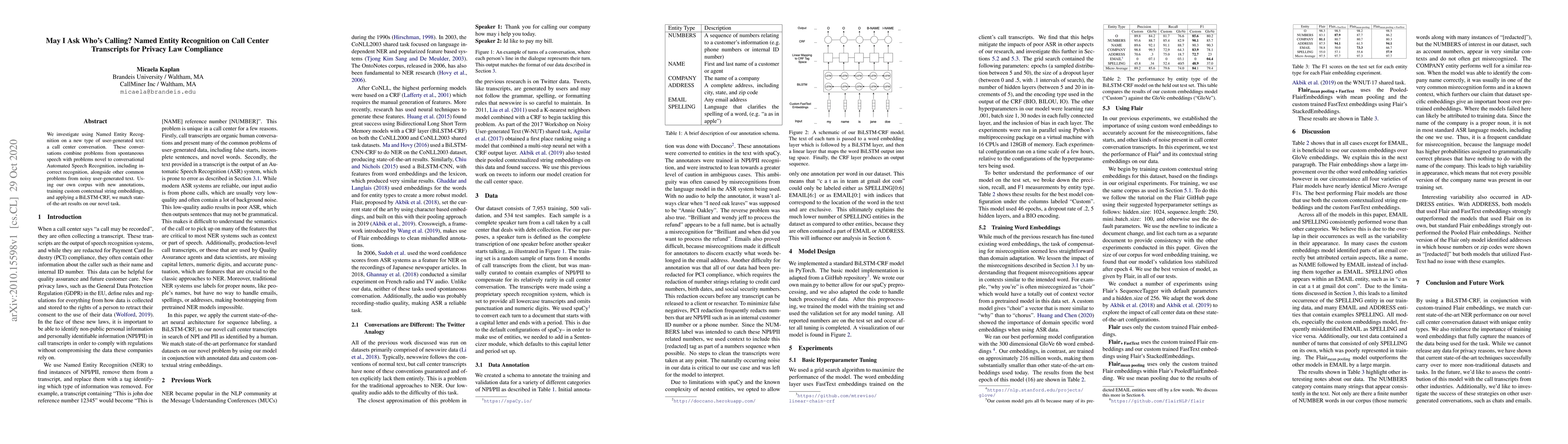 This paper explores Named Entity Recognition (NER) on call center transcripts to ensure compliance with privacy laws, addressing unique challenges from spontaneous speech and noisy data. The study achieves state-of-the-art results using custom contextual embeddings and a BiLSTM-CRF model.
