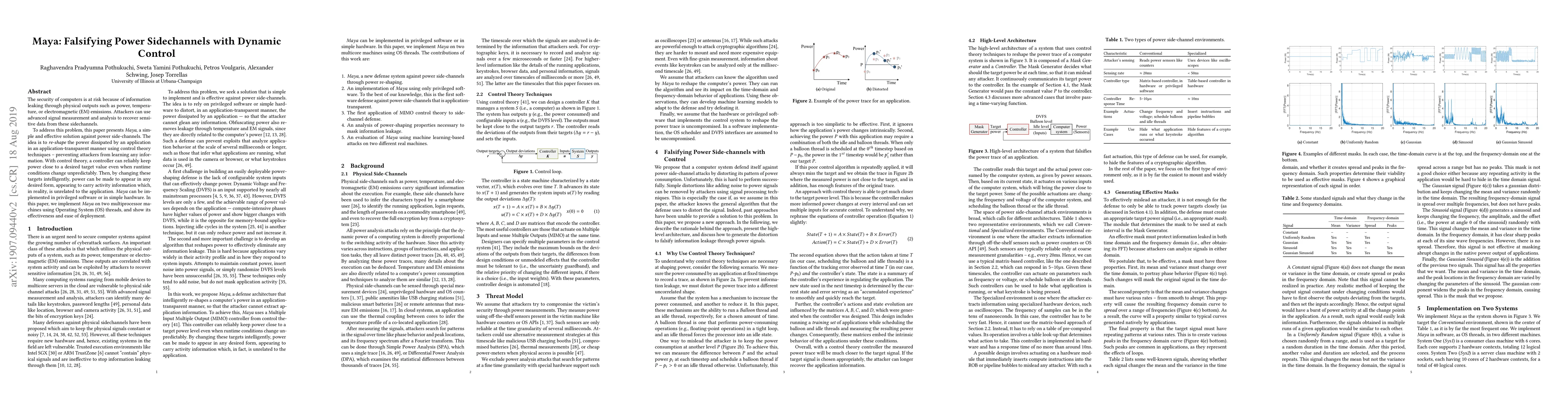 The security of computers is at risk because of information leaking through physical outputs such as power, temperature, or electromagnetic (EM) emissions. Attackers can use advanced signal measurement and analysis to recover sensitive data from these sidechannels. To address this problem, this paper presents Maya, a simple and effective solution against power side-channels. The idea is to re-shape the power dissipated by an application in an application-transparent manner using control theory techniques - preventing attackers from learning any information. With control theory, a controller can reliably keep power close to a desired target value even when runtime conditions change unpredictably. Then, by changing these targets intelligently, power can be made to appear in any desired form, appearing to carry activity information which, in reality, is unrelated to the application. Maya can be implemented in privileged software or in simple hardware. In this paper, we implement Maya on two multiprocessor machines using Operating System (OS) threads, and show its effectiveness and ease of deployment.