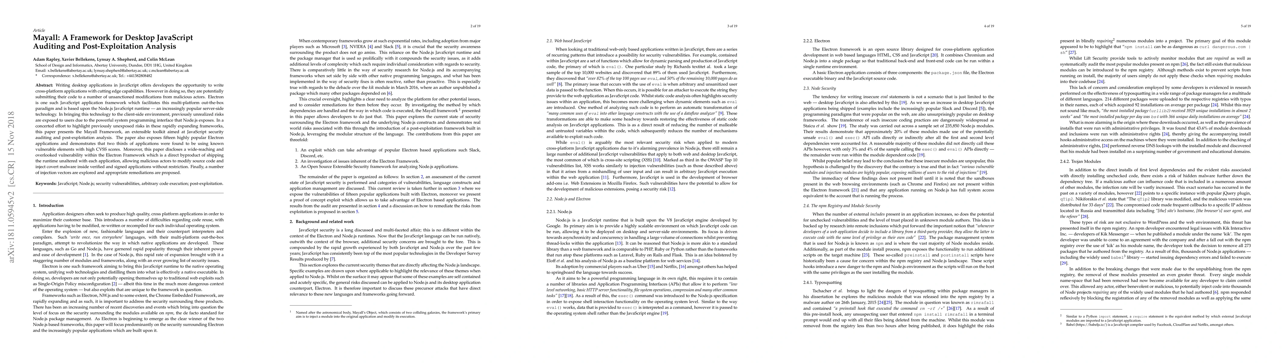 Writing desktop applications in JavaScript offers developers the opportunity to write cross-platform applications with cutting edge capabilities. However in doing so, they are potentially submitting their code to a number of unsanctioned modifications from malicious actors. Electron is one such JavaScript application framework which facilitates this multi-platform out-the-box paradigm and is based upon the Node.js JavaScript runtime --- an increasingly popular server-side technology. In bringing this technology to the client-side environment, previously unrealized risks are exposed to users due to the powerful system programming interface that Node.js exposes. In a concerted effort to highlight previously unexposed risks in these rapidly expanding frameworks, this paper presents the Mayall Framework, an extensible toolkit aimed at JavaScript security auditing and post-exploitation analysis. The paper also exposes fifteen highly popular Electron applications and demonstrates that two thirds of applications were found to be using known vulnerable elements with high CVSS scores. Moreover, this paper discloses a wide-reaching and overlooked vulnerability within the Electron Framework which is a direct byproduct of shipping the runtime unaltered with each application, allowing malicious actors to modify source code and inject covert malware inside verified and signed applications without restriction. Finally, a number of injection vectors are explored and appropriate remediations are proposed.