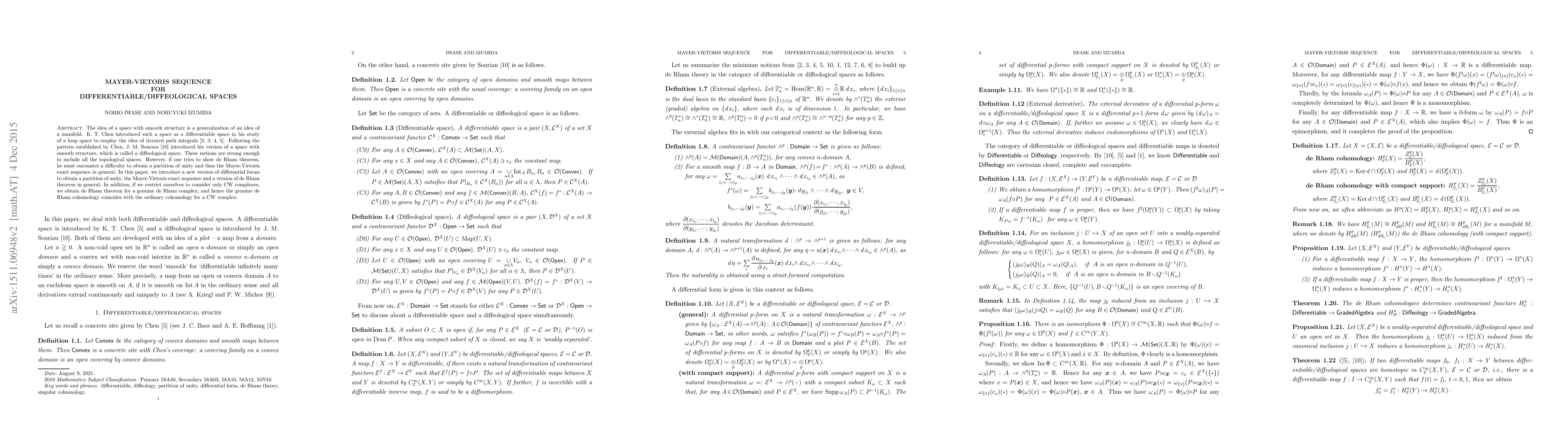 The idea of a space with smooth structure is a generalization of an idea of a manifold. K. T. Chen introduced such a space as a differentiable space in his study of a loop space to employ the idea of iterated path integrals \cite{Chen:73,Chen:75,Chen:77,Chen:86}. Following the pattern established by Chen, J. M. Souriau \cite{Souriau:80} introduced his version of a space with smooth structure, which is called a diffeological space. These notions are strong enough to include all the topological spaces. However, if one tries to show de Rham theorem, he must encounter a difficulty to obtain a partition of unity and thus the Mayer-Vietoris exact sequence in general. In this paper, we introduce a new version of differential forms to obtain a partition of unity, the Mayer-Vietoris exact sequence and a version of de Rham theorem in general. In addition, if we restrict ourselves to consider only CW complexes, we obtain de Rham theorem for a genuine de Rham complex, and hence the genuine de Rham cohomology coincides with the ordinary cohomology for a CW complex.