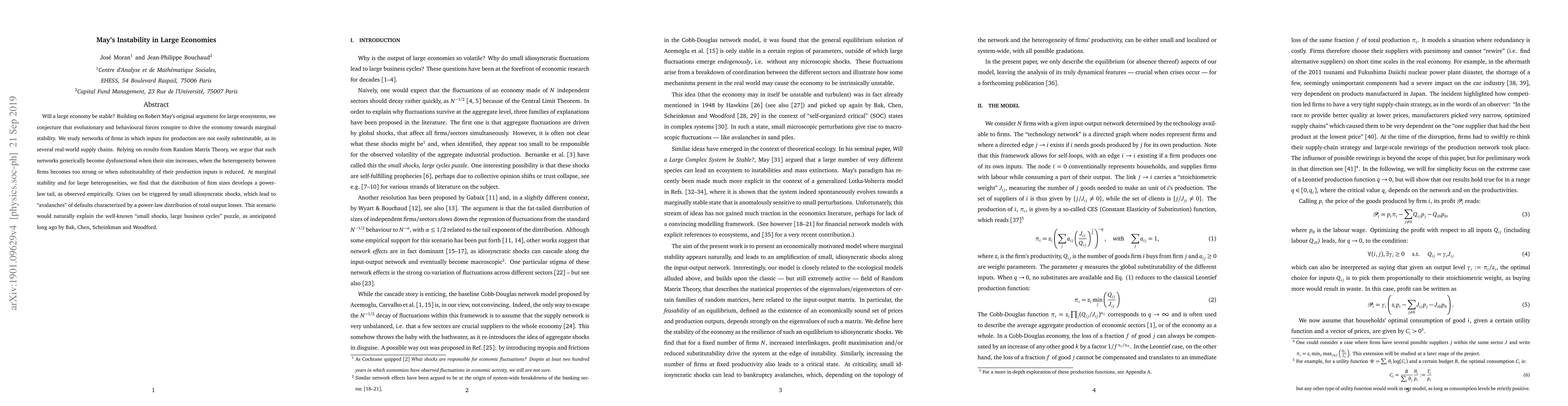 Will a large economy be stable? Building on Robert May's original argument for large ecosystems, we conjecture that evolutionary and behavioural forces conspire to drive the economy towards marginal stability. We study networks of firms in which inputs for production are not easily substitutable, as in several real-world supply chains. Relying on results from Random Matrix Theory, we argue that such networks generically become dysfunctional when their size increases, when the heterogeneity between firms becomes too strong or when substitutability of their production inputs is reduced. At marginal stability and for large heterogeneities, we find that the distribution of firm sizes develops a power-law tail, as observed empirically. Crises can be triggered by small idiosyncratic shocks, which lead to "avalanches" of defaults characterized by a power-law distribution of total output losses. This scenario would naturally explain the well-known "small shocks, large business cycles" puzzle, as anticipated long ago by Bak, Chen, Scheinkman and Woodford.