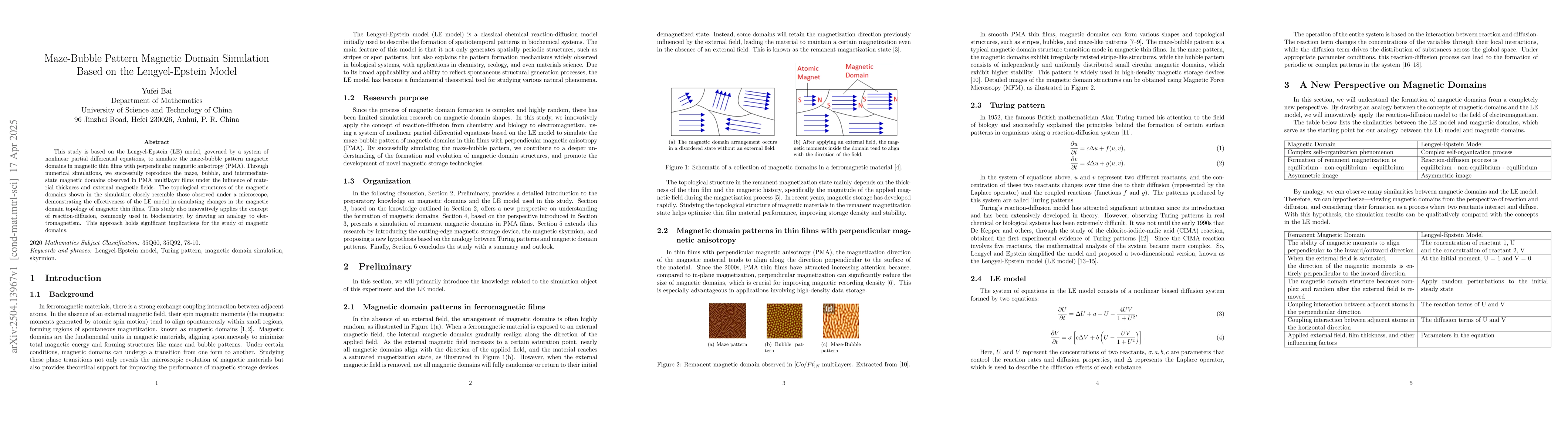 Researchers used the Lengyel-Epstein model to simulate magnetic domain patterns in thin films, successfully reproducing maze, bubble, and intermediate-state domains. The simulation results closely match microscope observations, highlighting the effectiveness of the model for studying magnetic domains.