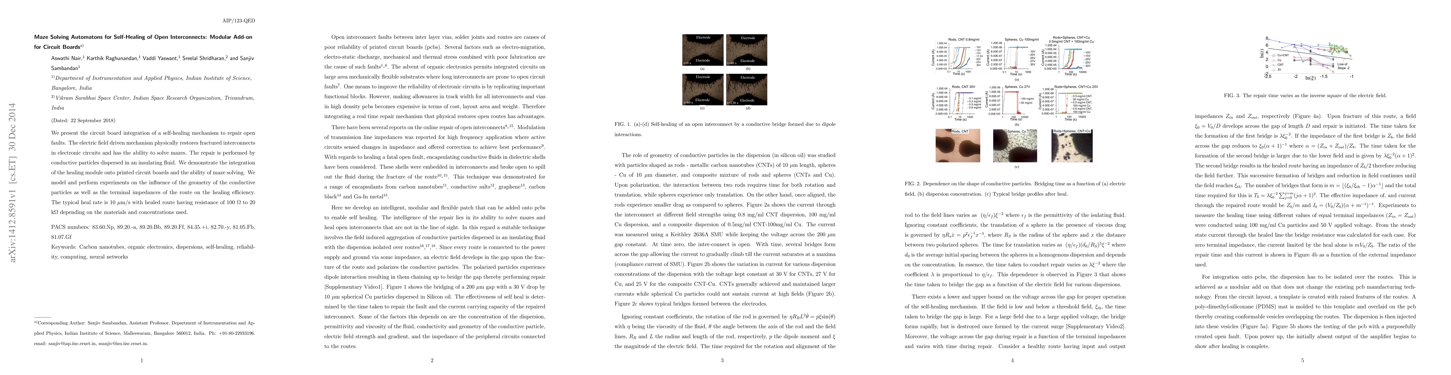 This paper presents a self-healing mechanism for circuit boards that uses electric field-driven conductive particles to repair open faults and solve mazes, achieving a typical heal rate of 10 $\mu$m/s. Experiments model the impact of particle geometry and terminal impedances on healing efficiency.