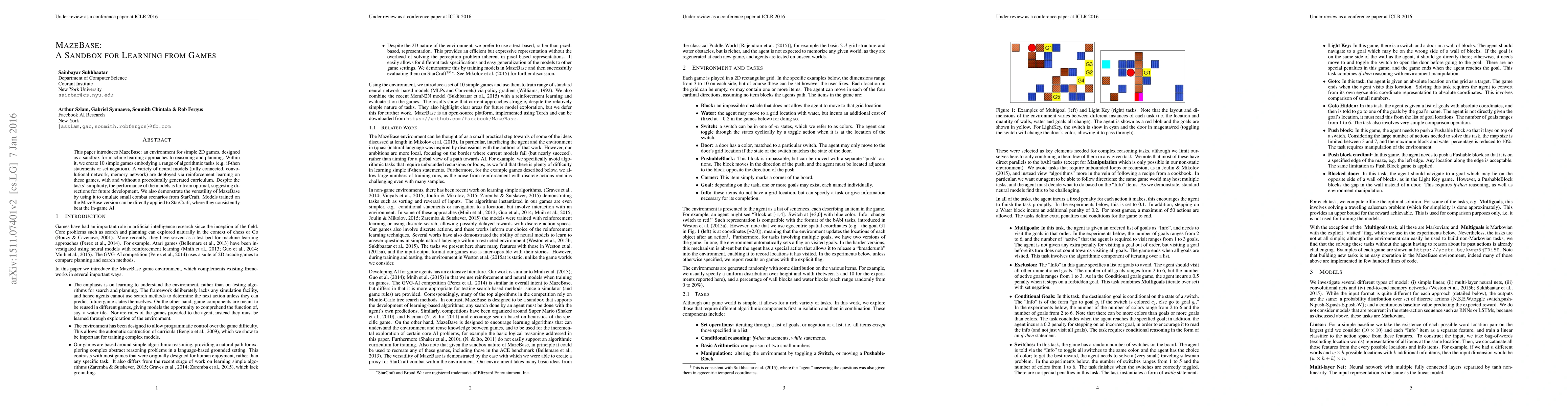 MazeBase is a sandbox for machine learning in simple 2D games, testing various neural models on algorithmic tasks. Despite the simplicity, models show suboptimal performance, indicating room for improvement, and can be applied to emulate StarCraft combat scenarios.