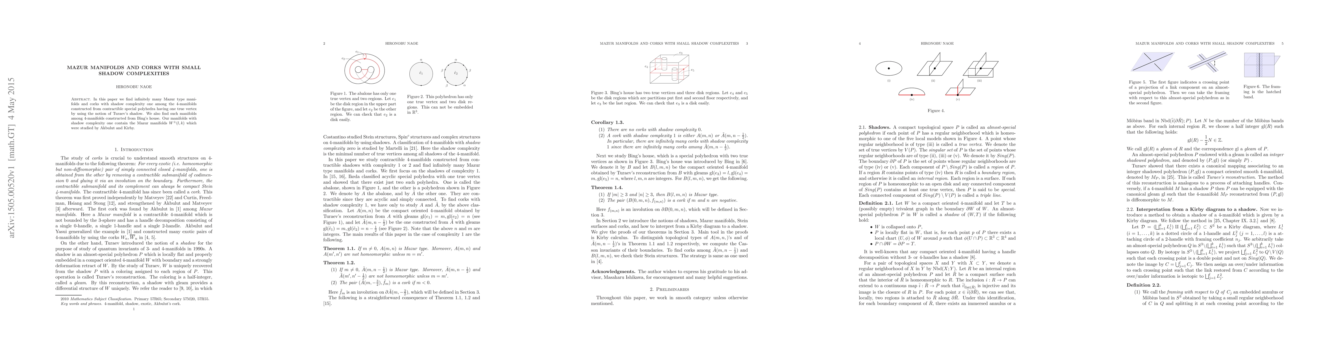 This paper identifies infinite families of Mazur type manifolds and corks with shadow complexity one in 4-manifolds derived from contractible special polyhedra and Bing's house, using Turaev's shadow concept, and includes the previously studied Mazur manifolds $W^{\pm}(l,k)$.
