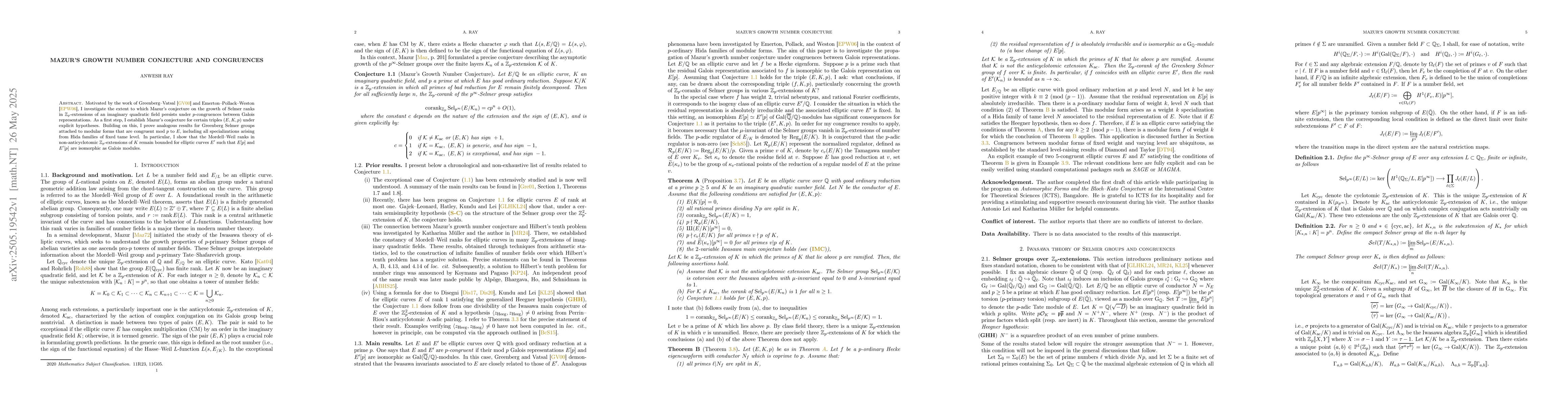 The paper investigates Mazur's growth number conjecture for certain triples of Galois representations under $p$-congruences, establishing bounds on Mordell-Weil ranks in non-anticyclotomic $oldsymbol{oldsymbol{Z}}_p$-extensions of imaginary quadratic fields.