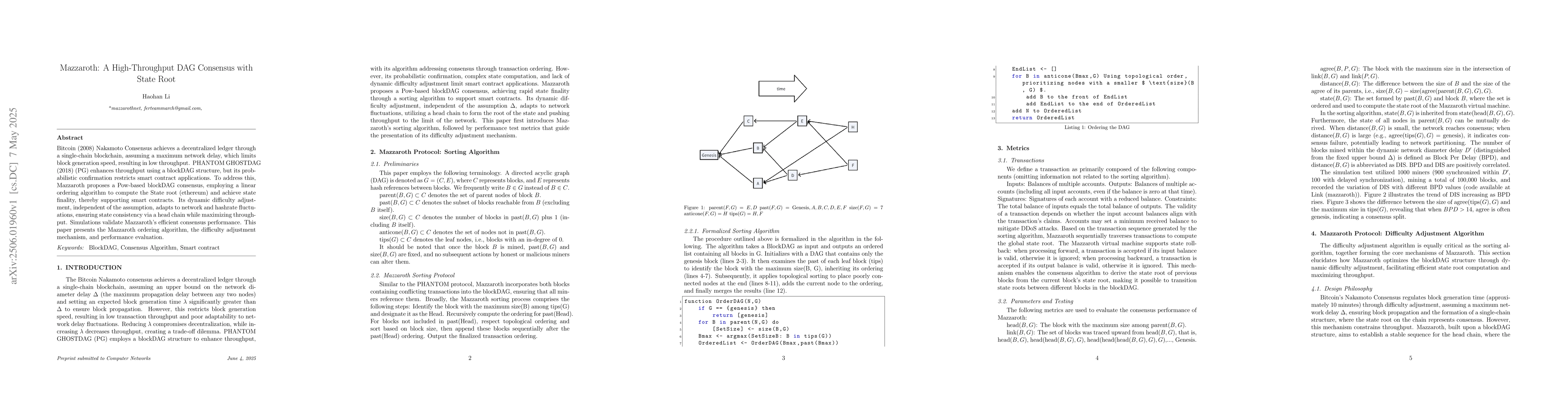 Mazzaroth proposes a high-throughput blockDAG consensus algorithm that supports smart contracts with state finality, maximizing network throughput while adapting to fluctuations in the network and hash rate.