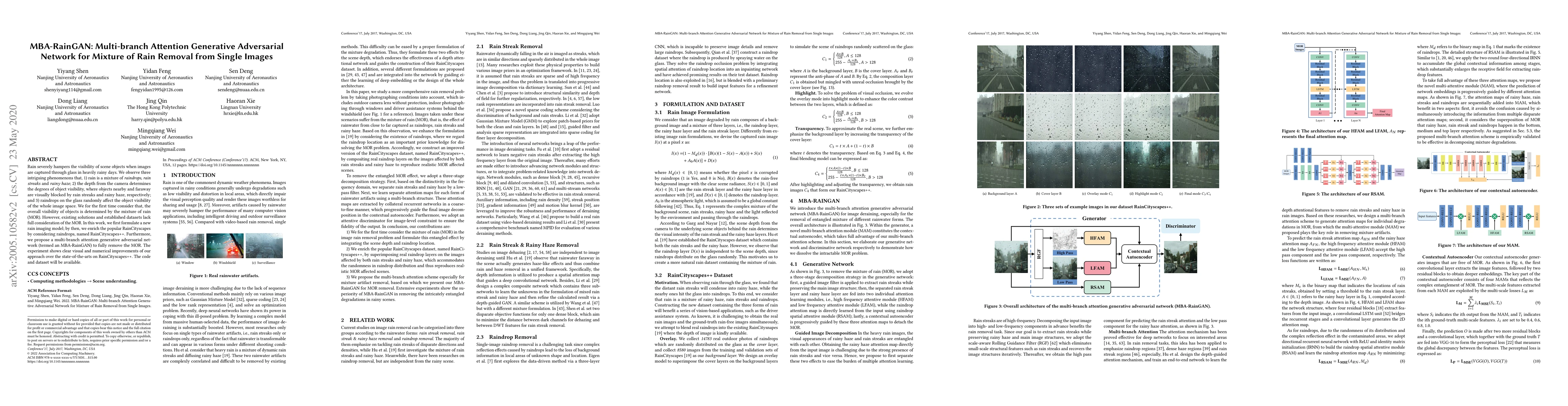 This paper introduces MBA-RainGAN, a multi-branch attention generative adversarial network designed to remove a mixture of rain (MOR) from single images captured through glass. The authors propose a new rain imaging model and enrich the RainCityscapes dataset to better reflect MOR, demonstrating superior performance over existing methods.