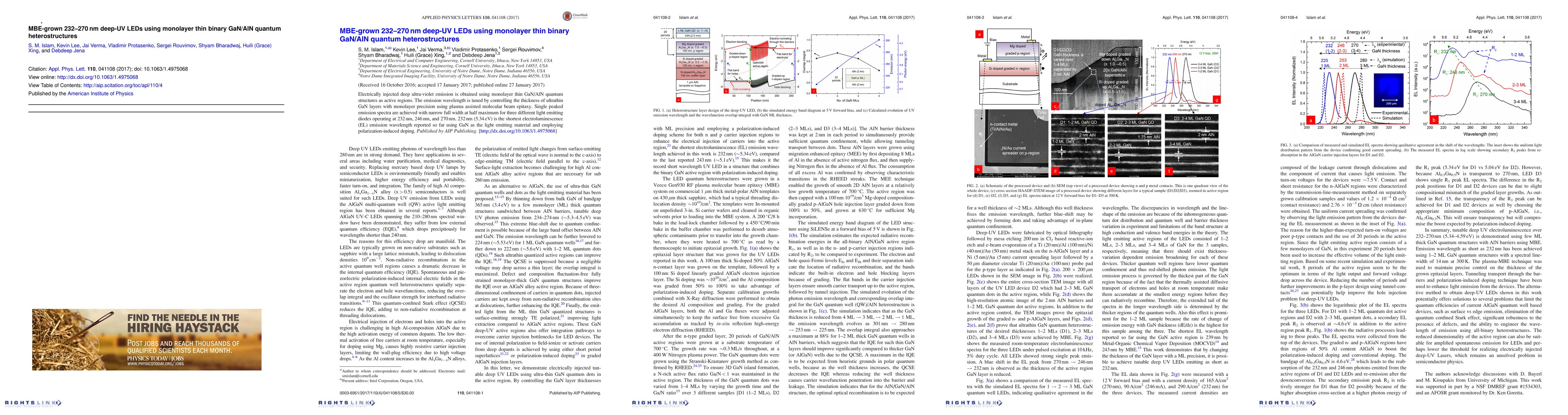 Researchers successfully grew deep-UV LEDs using monolayer GaN/AlN quantum structures, achieving wavelengths of 232nm, 246nm, and 270nm with narrow emission spectra.