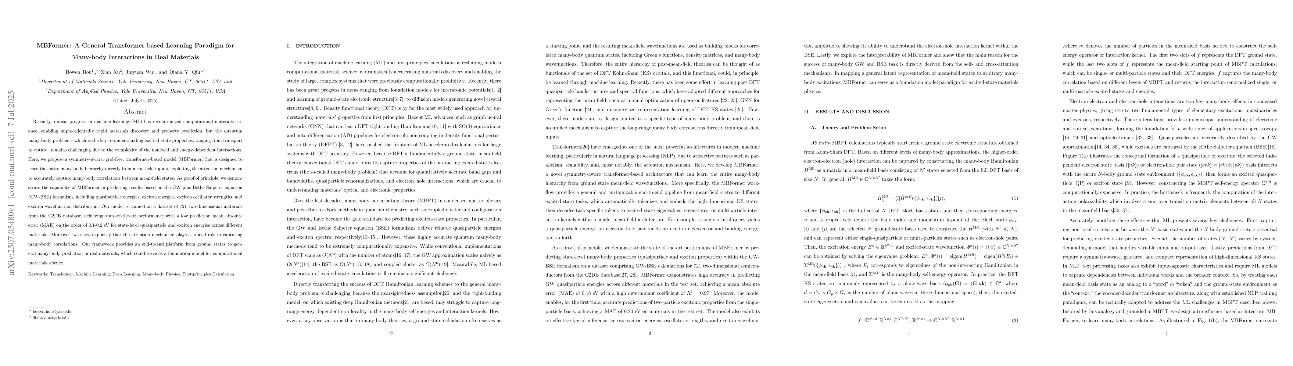 The research introduces MBFormer, a transformer-based model that learns many-body interactions directly from mean-field inputs, using an attention mechanism to capture correlations between mean-field states. It's trained on 721 two-dimensional materials from the C2DB database.