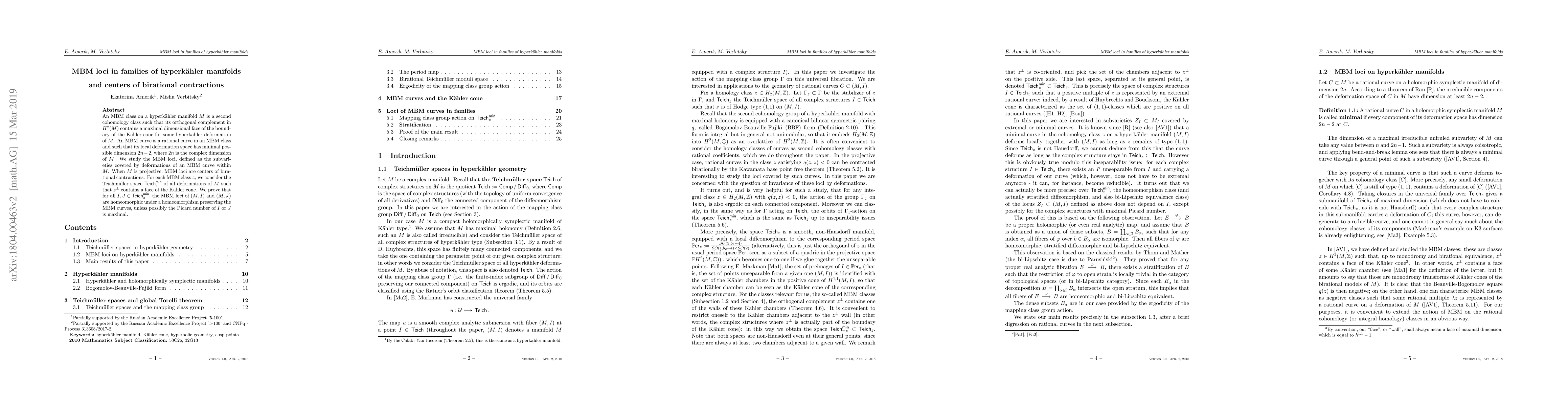 An MBM class on a hyperkahler manifold M is a second cohomology class such that its orthogonal complement in H^2(M) contains a maximal dimensional face of the boundary of the Kahler cone for some hyperkahler deformation of M. An MBM curve is a rational curve in an MBM class and such that its local deformation space has minimal possible dimension 2n-2, where 2n is the complex dimension of M. We study the MBM loci, defined as the subvarieties covered by deformations of an MBM curve within M. When M is projective, MBM loci are centers of birational contractions. For each MBM class z, we consider the Teichmuller space $Teich^{min}_z$ of all deformations of M such that $z^{\bot}$ contains a face of the Kahler cone. We prove that for all $I,J\in Teich^{min}_z$, the MBM loci of (M, I) and (M,J) are homeomorphic under a homeomorphism preserving the MBM curves, unless possibly the Picard number of I or J is maximal.
