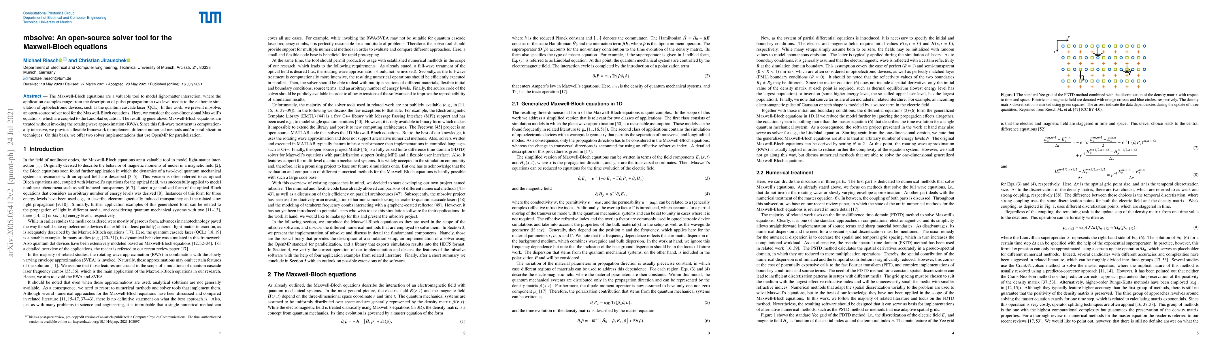 Mbsolve is an open-source solver tool for the Maxwell-Bloch equations, designed to model light-matter interactions without the rotating wave approximation. It provides flexible numerical methods and parallelization techniques, including OpenMP implementations, for efficient computation.