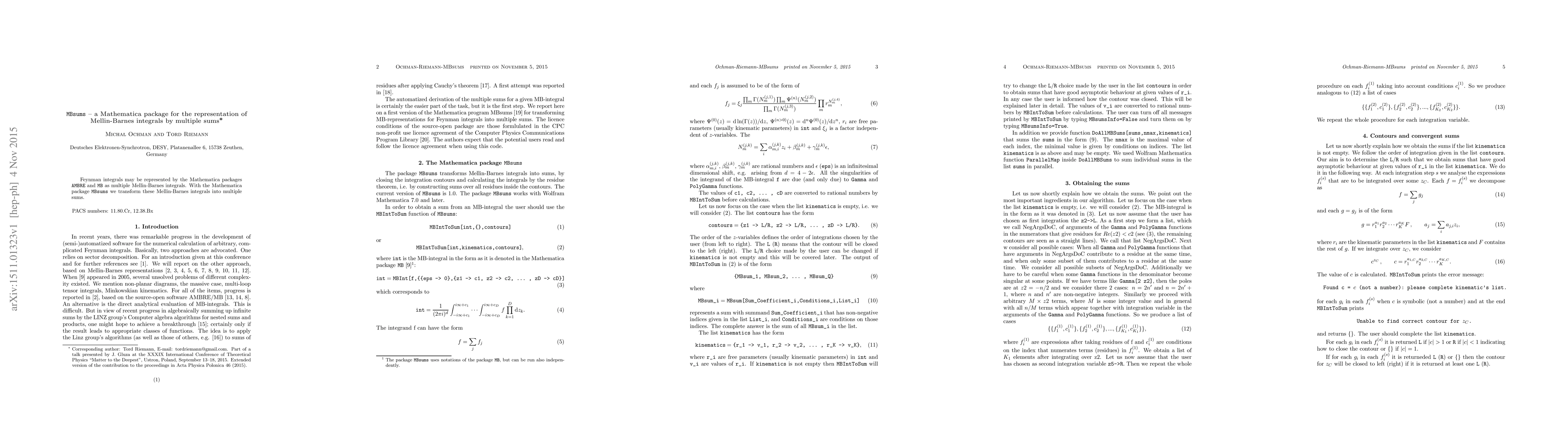 Summary: MBsums is a Mathematica package that converts Mellin-Barnes integrals, which represent Feynman integrals, into equivalent multiple sums for easier manipulation and computation. This transformation aids in the analysis and evaluation of complex integrals in theoretical physics.