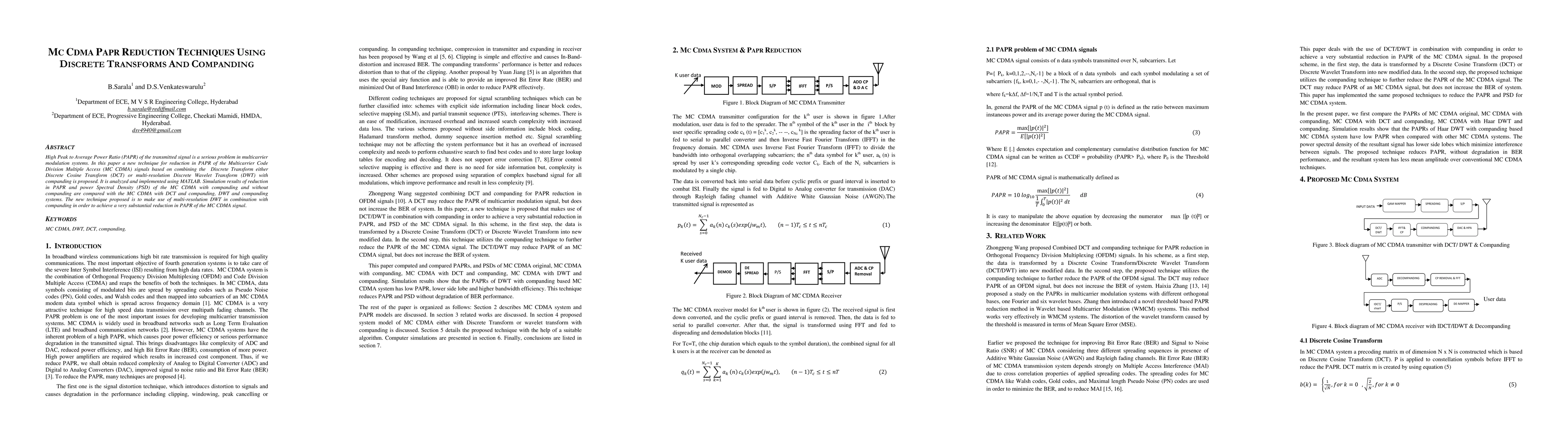 This paper proposes a novel technique for reducing the PAPR in MC CDMA signals by combining discrete transforms (DCT or DWT) with companding. Simulation results show significant PAPR reduction when using multi-resolution DWT with companding compared to DCT and DWT alone.