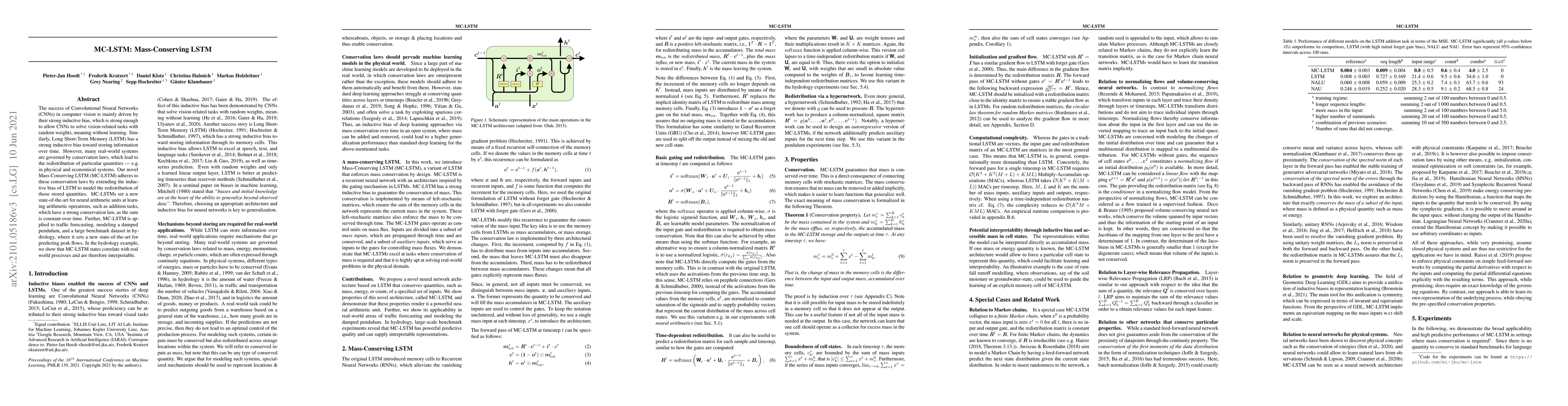 The paper introduces the Mass-Conserving LSTM (MC-LSTM), an extension of LSTM that incorporates conservation laws, achieving state-of-the-art results in neural arithmetic and systems governed by conservation, such as traffic forecasting and hydrology. MC-LSTM's states correlate with real-world processes, enhancing interpretability.