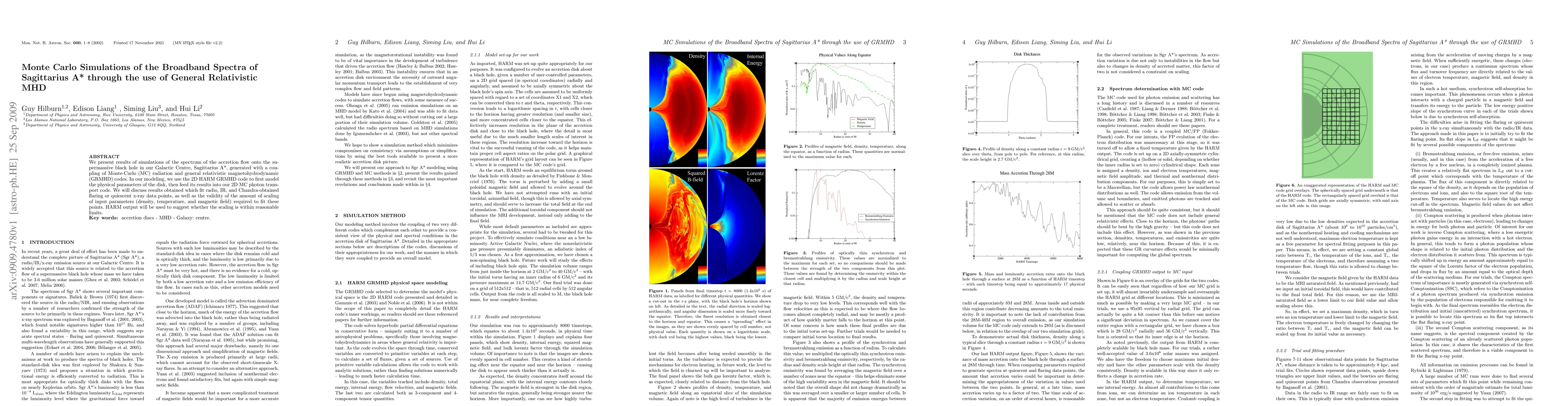This paper presents Monte-Carlo simulations of Sagittarius A*'s broadband spectra using a combination of GRMHD and photon transport codes. The study fits observed radio, IR, and X-ray data, assessing the validity of scaling parameters like density, temperature, and magnetic field through the HARM GRMHD code.