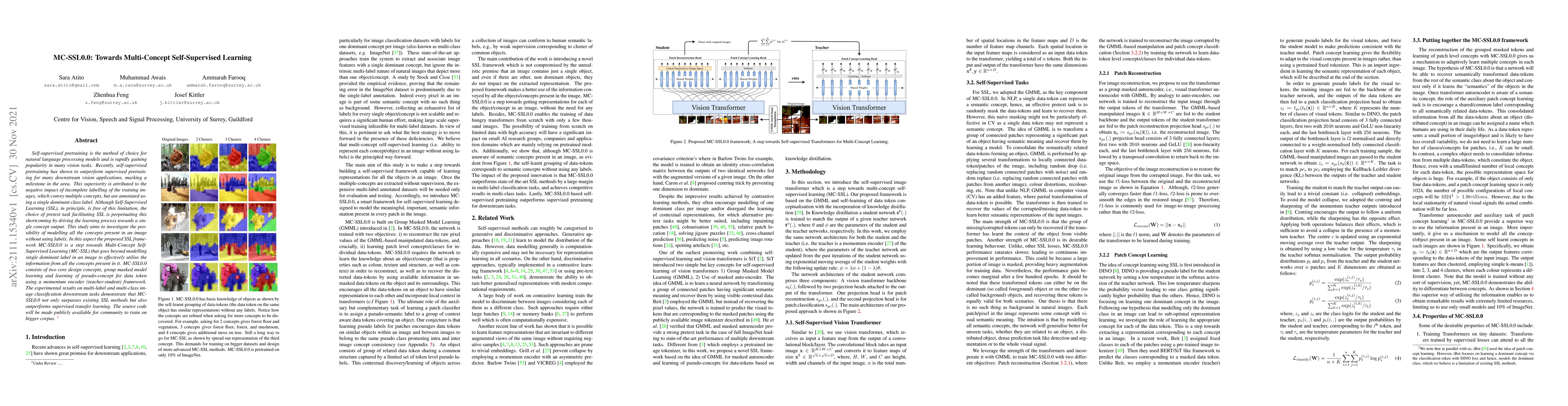Self-supervised pretraining is the method of choice for natural language processing models and is rapidly gaining popularity in many vision tasks. Recently, self-supervised pretraining has shown to outperform supervised pretraining for many downstream vision applications, marking a milestone in the area. This superiority is attributed to the negative impact of incomplete labelling of the training images, which convey multiple concepts, but are annotated using a single dominant class label. Although Self-Supervised Learning (SSL), in principle, is free of this limitation, the choice of pretext task facilitating SSL is perpetuating this shortcoming by driving the learning process towards a single concept output. This study aims to investigate the possibility of modelling all the concepts present in an image without using labels. In this aspect the proposed SSL frame-work MC-SSL0.0 is a step towards Multi-Concept Self-Supervised Learning (MC-SSL) that goes beyond modelling single dominant label in an image to effectively utilise the information from all the concepts present in it. MC-SSL0.0 consists of two core design concepts, group masked model learning and learning of pseudo-concept for data token using a momentum encoder (teacher-student) framework. The experimental results on multi-label and multi-class image classification downstream tasks demonstrate that MC-SSL0.0 not only surpasses existing SSL methods but also outperforms supervised transfer learning. The source code will be made publicly available for community to train on bigger corpus.