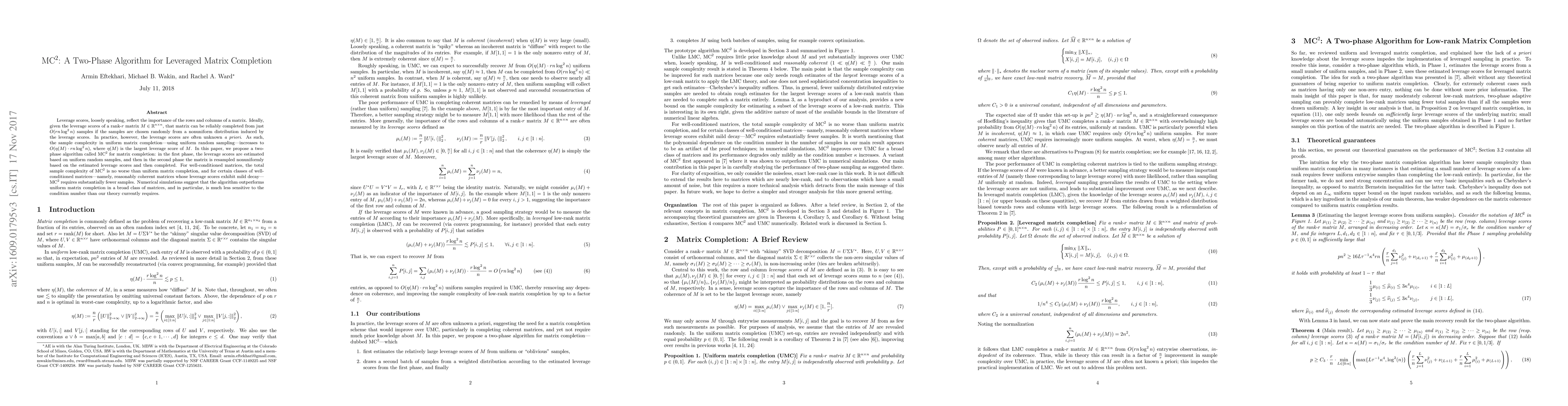 A new algorithm called MC^2 improves matrix completion efficiency by first estimating leverage scores with uniform samples and then resampling non-uniformly based on those estimates, outperforming traditional methods in a broad class of matrices.