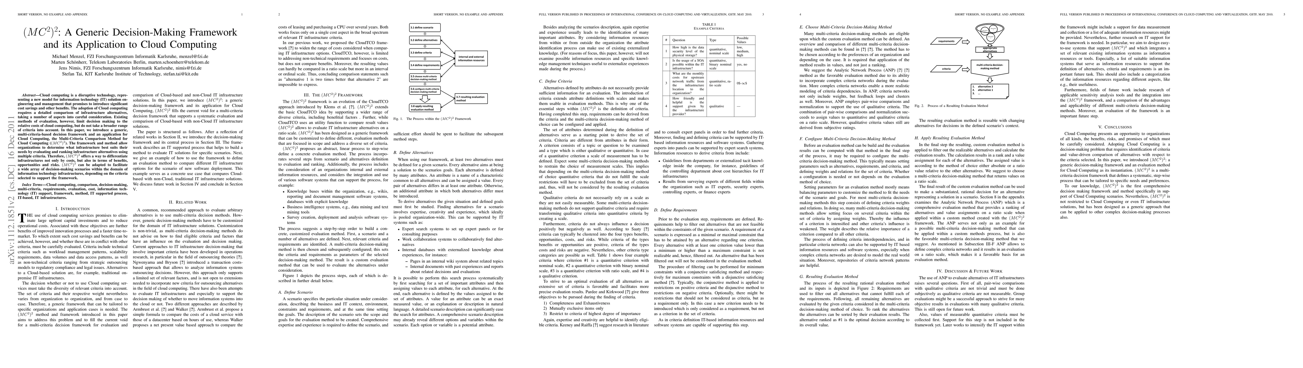 This paper introduces a generic multi-criteria decision-making framework called (MC2)2, designed to evaluate and compare cloud computing infrastructure alternatives. The framework enables organizations to assess infrastructures based on a broader set of criteria beyond just costs, including benefits, opportunities, and risks.
