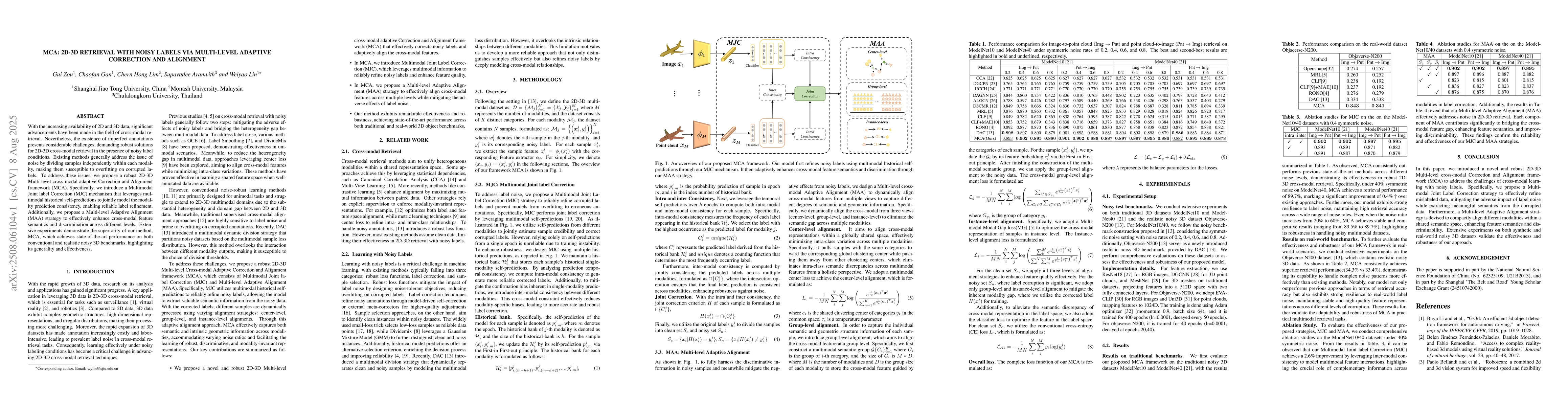 With the increasing availability of 2D and 3D data, significant advancements have been made in the field of cross-modal retrieval. Nevertheless, the existence of imperfect annotations presents considerable challenges, demanding robust solutions for 2D-3D cross-modal retrieval in the presence of noisy label conditions. Existing methods generally address the issue of noise by dividing samples independently within each modality, making them susceptible to overfitting on corrupted labels. To address these issues, we propose a robust 2D-3D \textbf{M}ulti-level cross-modal adaptive \textbf{C}orrection and \textbf{A}lignment framework (MCA). Specifically, we introduce a Multimodal Joint label Correction (MJC) mechanism that leverages multimodal historical self-predictions to jointly model the modality prediction consistency, enabling reliable label refinement. Additionally, we propose a Multi-level Adaptive Alignment (MAA) strategy to effectively enhance cross-modal feature semantics and discrimination across different levels. Extensive experiments demonstrate the superiority of our method, MCA, which achieves state-of-the-art performance on both conventional and realistic noisy 3D benchmarks, highlighting its generality and effectiveness.