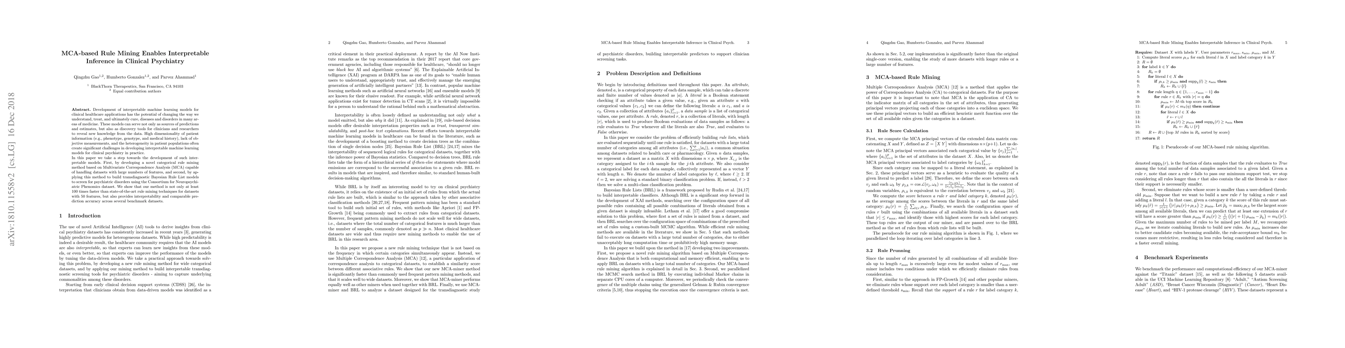 This paper introduces a novel MCA-based rule mining method for developing interpretable machine learning models, specifically for clinical psychiatry. The method, applied to the Consortium for Neuropsychiatric Phenomics dataset, demonstrates significant speed improvements and comparable accuracy, offering a new tool for psychiatric disorder screening.