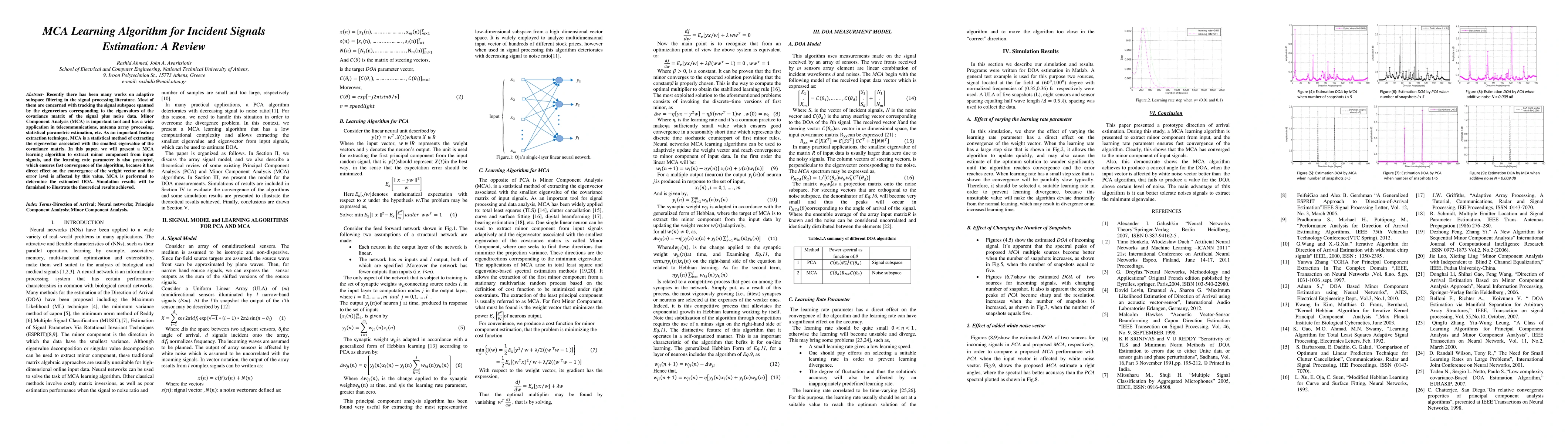 The paper presents a MCA learning algorithm for incident signals estimation, ensuring fast convergence through a learning rate parameter. It compares MCA with PCA in DOA measurement models, demonstrating MCA's superior noise tolerance.