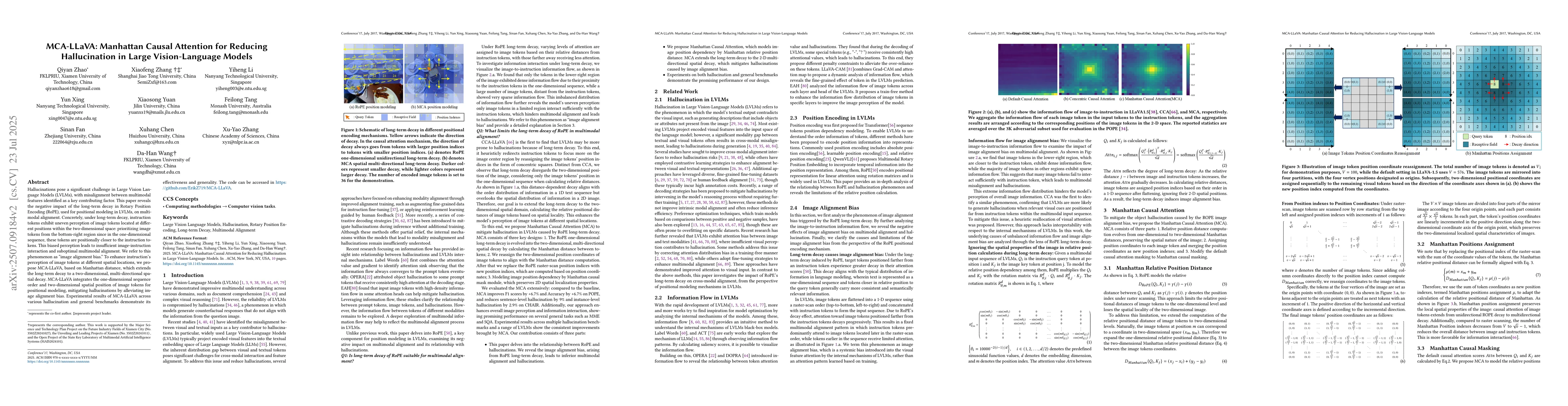 Hallucinations pose a significant challenge in Large Vision Language Models (LVLMs), with misalignment between multimodal features identified as a key contributing factor. This paper reveals the negative impact of the long-term decay in Rotary Position Encoding (RoPE), used for positional modeling in LVLMs, on multimodal alignment. Concretely, under long-term decay, instruction tokens exhibit uneven perception of image tokens located at different positions within the two-dimensional space: prioritizing image tokens from the bottom-right region since in the one-dimensional sequence, these tokens are positionally closer to the instruction tokens. This biased perception leads to insufficient image-instruction interaction and suboptimal multimodal alignment. We refer to this phenomenon as image alignment bias. To enhance instruction's perception of image tokens at different spatial locations, we propose MCA-LLaVA, based on Manhattan distance, which extends the long-term decay to a two-dimensional, multi-directional spatial decay. MCA-LLaVA integrates the one-dimensional sequence order and two-dimensional spatial position of image tokens for positional modeling, mitigating hallucinations by alleviating image alignment bias. Experimental results of MCA-LLaVA across various hallucination and general benchmarks demonstrate its effectiveness and generality. The code can be accessed in https://github.com/ErikZ719/MCA-LLaVA.