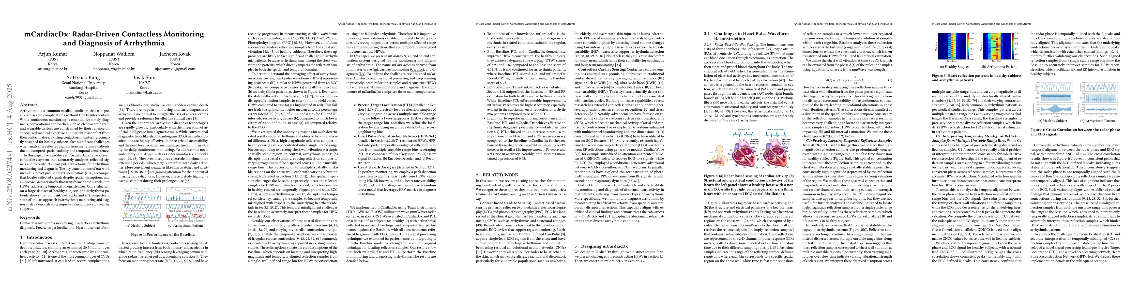 The research introduces mCardiacDx, a radar-driven contactless system that uses a novel precise target localization (PTL) technique and an encoder-decoder model to analyze reflected signals and reconstruct heart pulse waveforms (HPWs) for arrhythmia monitoring and diagnosis.