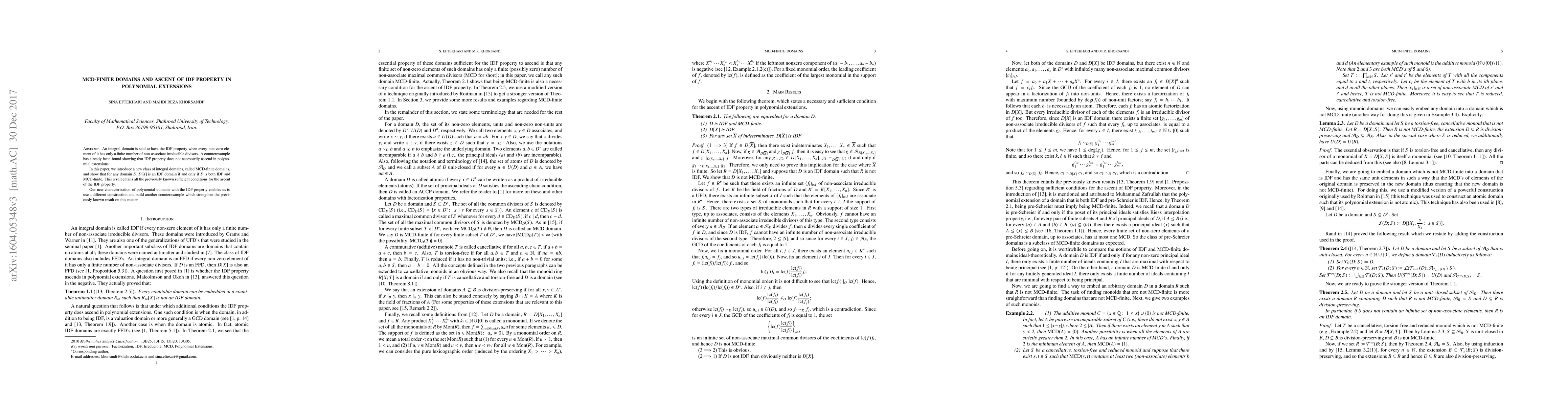An integral domain is said to have the IDF property when every non-zero element of it has only a finite number of non-associate irreducible divisors. A counterexample has already been found showing that IDF property does not necessarily ascend in polynomial extensions. In this paper, we introduce a new class of integral domains, called MCD-finite domains, and show that for any domain $D$, $D[X]$ is an IDF domain if and only if $D$ is both IDF and MCD-finite. This result entails all the previously known sufficient conditions for the ascent of the IDF property. Our new characterization of polynomial domains with the IDF property enables us to use a different construction and build another counterexample which strengthen the previously known result on this matter.