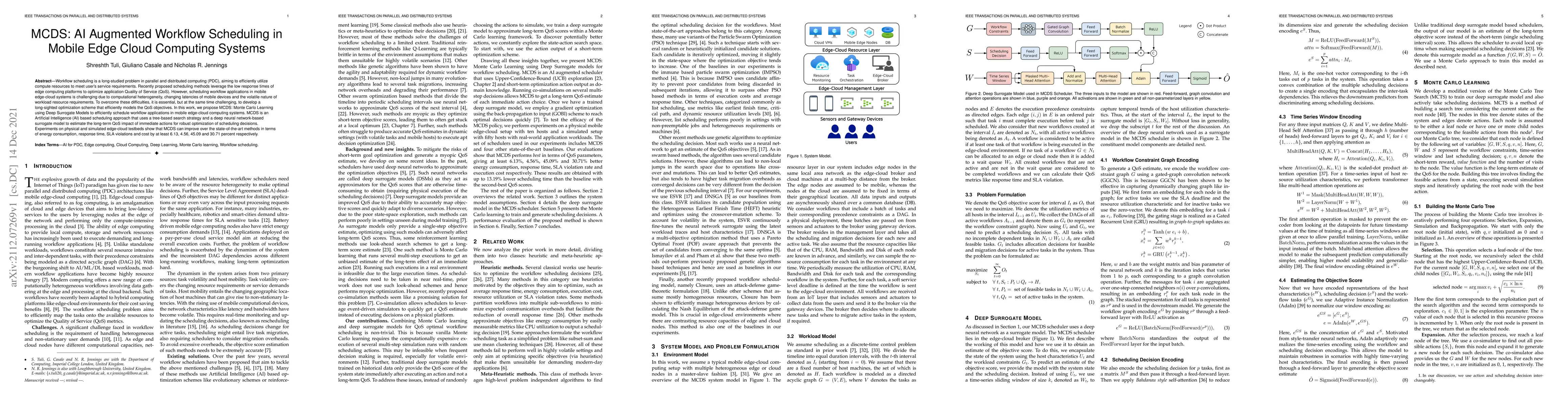 The paper proposes MCDS, an AI-augmented workflow scheduling method for mobile edge-cloud computing systems, which utilizes deep surrogate models and a tree-based search strategy to optimize Quality of Service objectives. Experiments demonstrate MCDS's superiority over state-of-the-art methods in energy efficiency, response time, SLA compliance, and cost reduction.