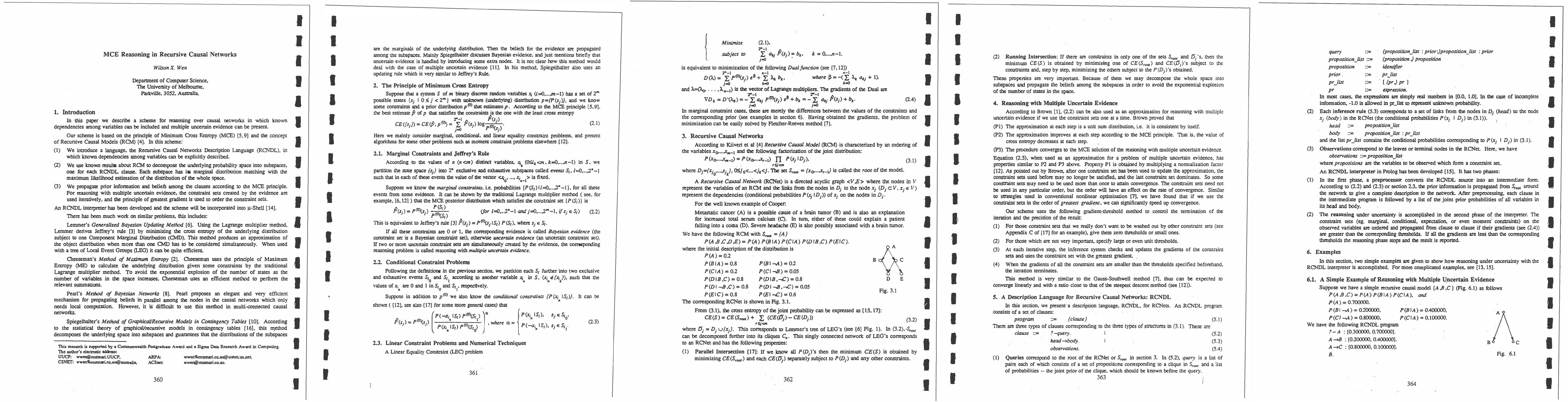 This paper proposes a probabilistic reasoning method using Minimum Cross Entropy (MCE) within Recursive Causal Networks (RCM), utilizing BNDL for describing dependencies. Performance is benchmarked against other methods using Prolog and C interpreters for BNDL.
