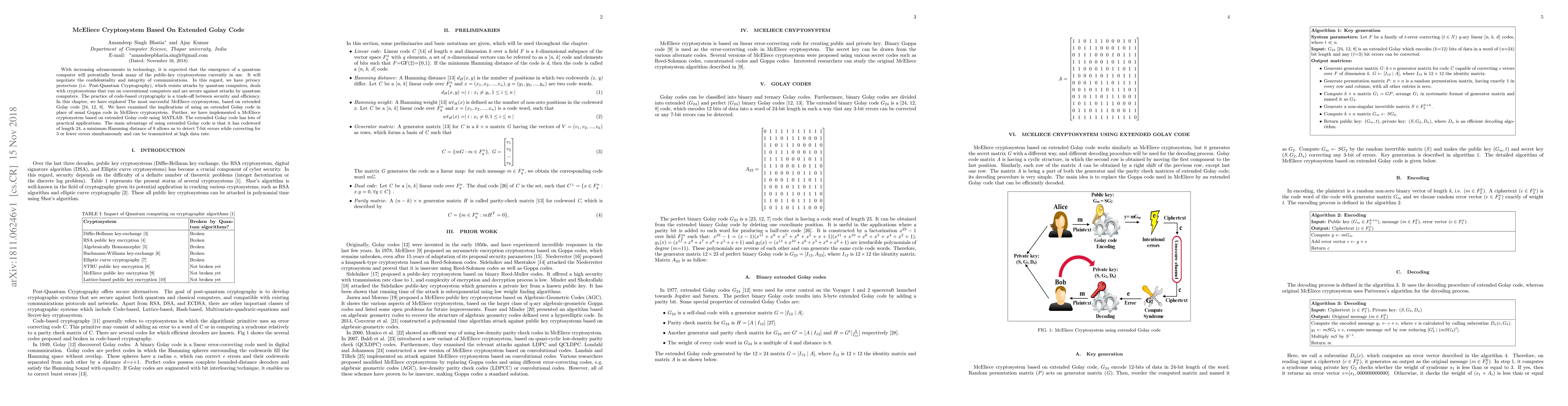 With increasing advancements in technology, it is expected that the emergence of a quantum computer will potentially break many of the public-key cryptosystems currently in use. It will negotiate the confidentiality and integrity of communications. In this regard, we have privacy protectors (i.e. Post-Quantum Cryptography), which resists attacks by quantum computers, deals with cryptosystems that run on conventional computers and are secure against attacks by quantum computers. The practice of code-based cryptography is a trade-off between security and efficiency. In this chapter, we have explored The most successful McEliece cryptosystem, based on extended Golay code [24, 12, 8]. We have examined the implications of using an extended Golay code in place of usual Goppa code in McEliece cryptosystem. Further, we have implemented a McEliece cryptosystem based on extended Golay code using MATLAB. The extended Golay code has lots of practical applications. The main advantage of using extended Golay code is that it has codeword of length 24, a minimum Hamming distance of 8 allows us to detect 7-bit errors while correcting for 3 or fewer errors simultaneously and can be transmitted at high data rate.