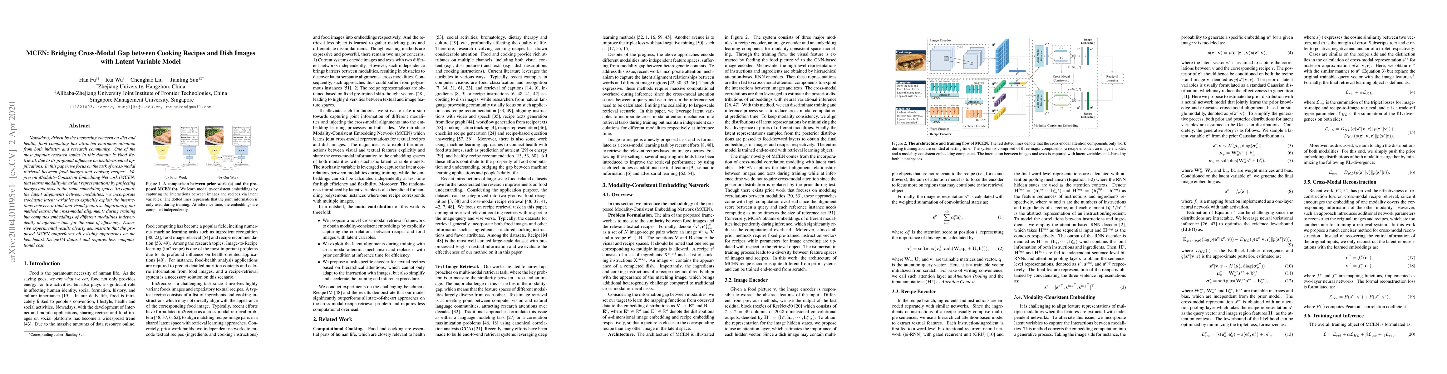The paper introduces MCEN, a Modality-Consistent Embedding Network that bridges the gap between cooking recipes and dish images by learning modality-invariant representations. It uses latent variable models to capture interactions between textual and visual features, achieving superior performance on the Recipe1M dataset with lower computational costs.