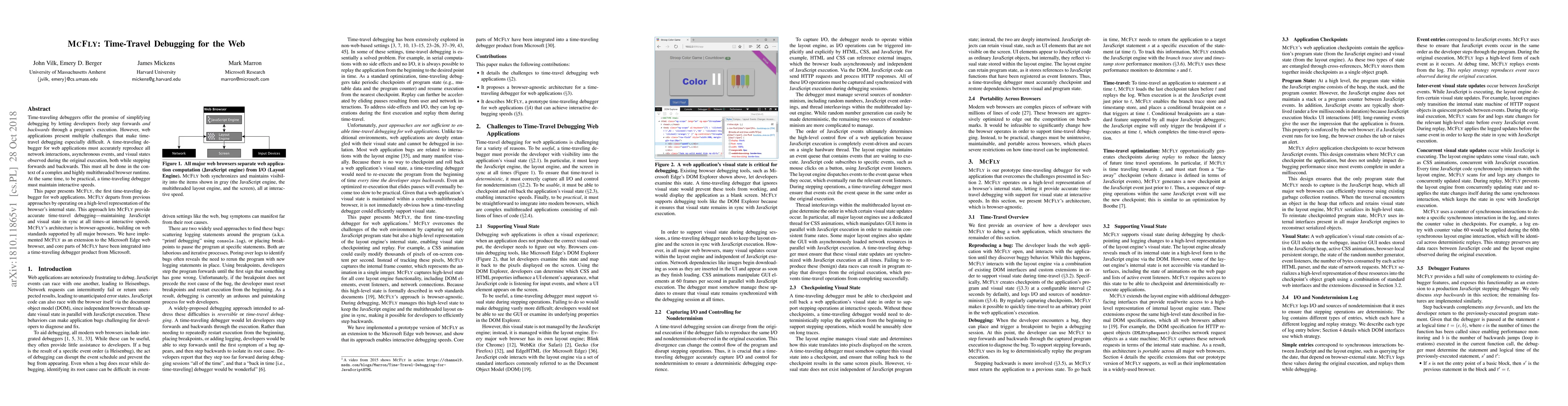 McFly is a novel time-traveling debugger for web applications that allows developers to step forwards and backwards through program execution, addressing the complexities of browser runtimes and asynchronous events. It achieves interactive speeds by operating on a high-level representation of the browser's internal state, ensuring accurate synchronization of JavaScript and visual states.