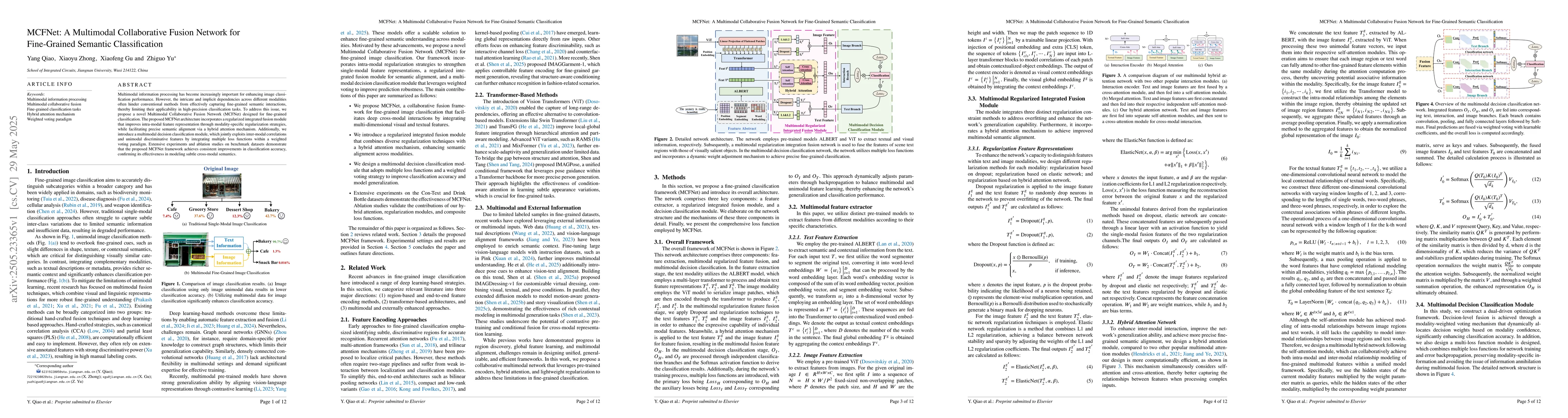 The main technical contribution is the proposal of MCFNet, a multimodal collaborative fusion network that integrates a regularized integrated fusion module and a multi-modal decision classification module for fine-grained semantic classification tasks.