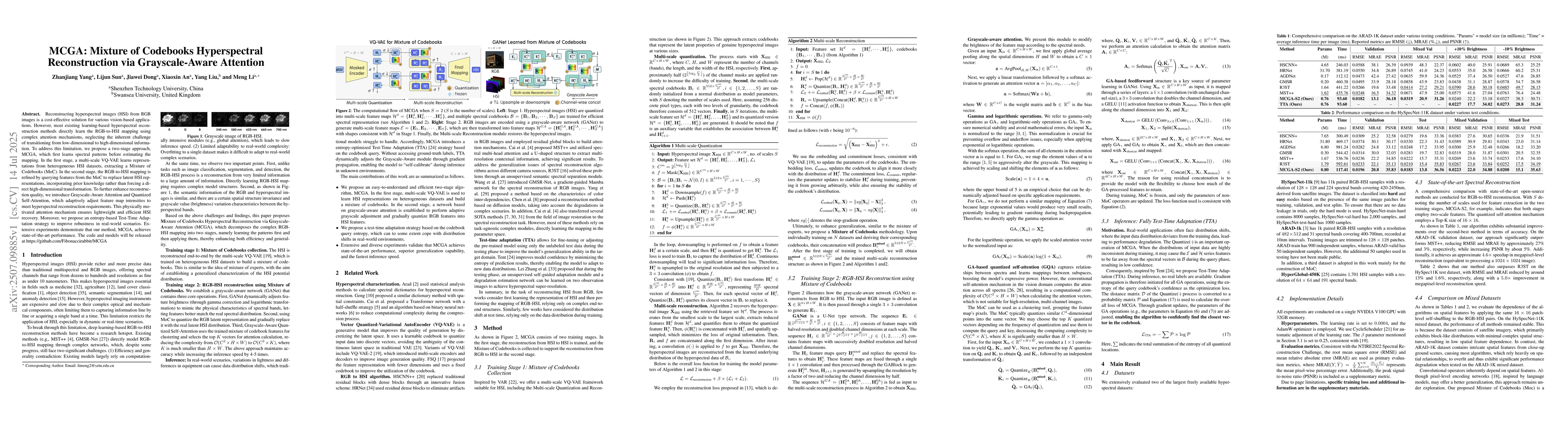 Reconstructing hyperspectral images (HSI) from RGB images is a cost-effective solution for various vision-based applications. However, most existing learning-based hyperspectral reconstruction methods directly learn the RGB-to-HSI mapping using complex attention mechanisms, neglecting the inherent challenge of transitioning from low-dimensional to high-dimensional information. To address this limitation, we propose a two-stage approach, MCGA, which first learns spectral patterns before estimating the mapping. In the first stage, a multi-scale VQ-VAE learns representations from heterogeneous HSI datasets, extracting a Mixture of Codebooks (MoC). In the second stage, the RGB-to-HSI mapping is refined by querying features from the MoC to replace latent HSI representations, incorporating prior knowledge rather than forcing a direct high-dimensional transformation. To further enhance reconstruction quality, we introduce Grayscale-Aware Attention and Quantized Self-Attention, which adaptively adjust feature map intensities to meet hyperspectral reconstruction requirements. This physically motivated attention mechanism ensures lightweight and efficient HSI recovery. Moreover, we propose an entropy-based Test-Time Adaptation strategy to improve robustness in real-world scenarios. Extensive experiments demonstrate that our method, MCGA, achieves state-of-the-art performance. The code and models will be released at https://github.com/Fibonaccirabbit/MCGA