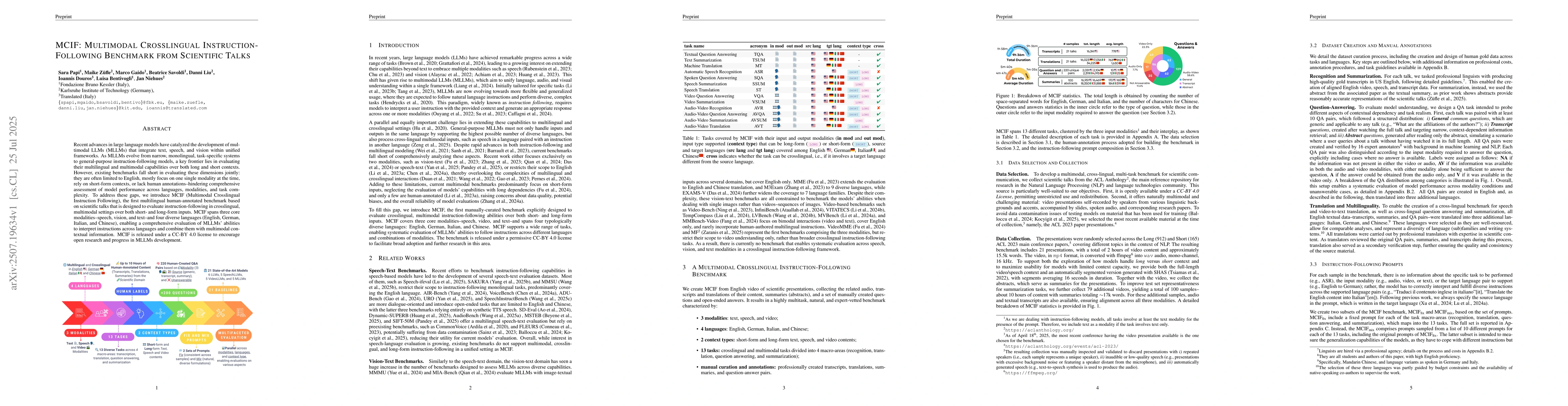 Recent advances in large language models have catalyzed the development of multimodal LLMs (MLLMs) that integrate text, speech, and vision within unified frameworks. As MLLMs evolve from narrow, monolingual, task-specific systems to general-purpose instruction-following models, a key frontier lies in evaluating their multilingual and multimodal capabilities over both long and short contexts. However, existing benchmarks fall short in evaluating these dimensions jointly: they are often limited to English, mostly focus on one single modality at a time, rely on short-form contexts, or lack human annotations -- hindering comprehensive assessment of model performance across languages, modalities, and task complexity. To address these gaps, we introduce MCIF (Multimodal Crosslingual Instruction Following), the first multilingual human-annotated benchmark based on scientific talks that is designed to evaluate instruction-following in crosslingual, multimodal settings over both short- and long-form inputs. MCIF spans three core modalities -- speech, vision, and text -- and four diverse languages (English, German, Italian, and Chinese), enabling a comprehensive evaluation of MLLMs' abilities to interpret instructions across languages and combine them with multimodal contextual information. MCIF is released under a CC-BY 4.0 license to encourage open research and progress in MLLMs development.