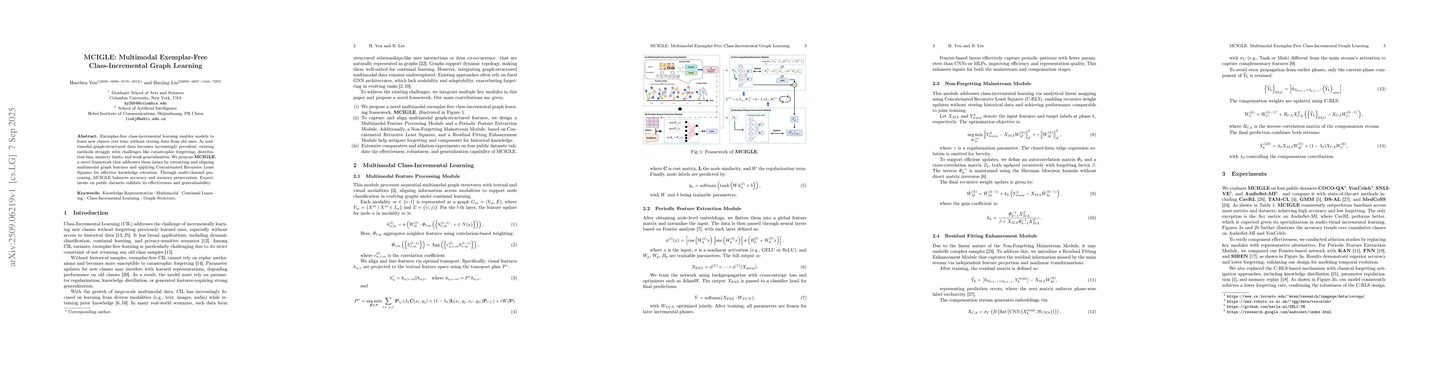 Exemplar-free class-incremental learning enables models to learn new classes over time without storing data from old ones. As multimodal graph-structured data becomes increasingly prevalent, existing methods struggle with challenges like catastrophic forgetting, distribution bias, memory limits, and weak generalization. We propose MCIGLE, a novel framework that addresses these issues by extracting and aligning multimodal graph features and applying Concatenated Recursive Least Squares for effective knowledge retention. Through multi-channel processing, MCIGLE balances accuracy and memory preservation. Experiments on public datasets validate its effectiveness and generalizability.