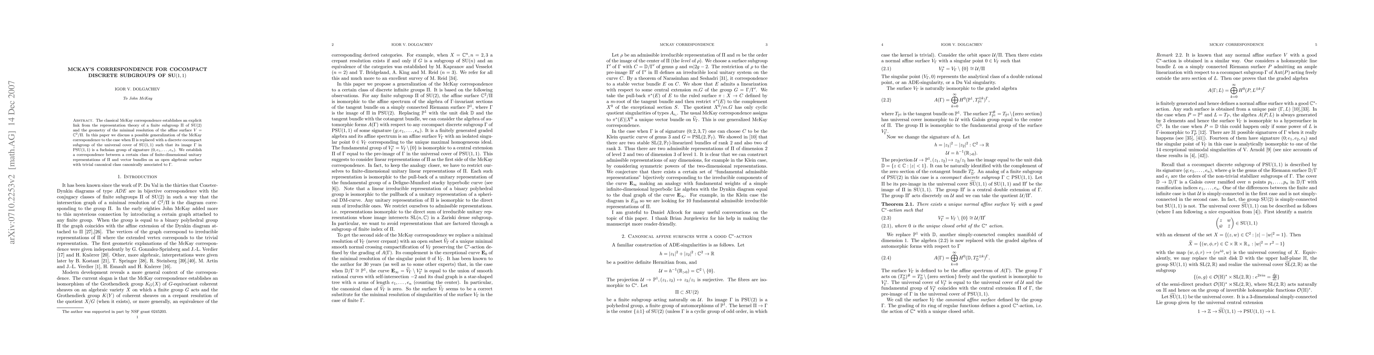 Researchers generalize McKay's correspondence to cocompact discrete subgroups of SU(1,1), linking finite-dimensional representations to vector bundles on algebraic surfaces.