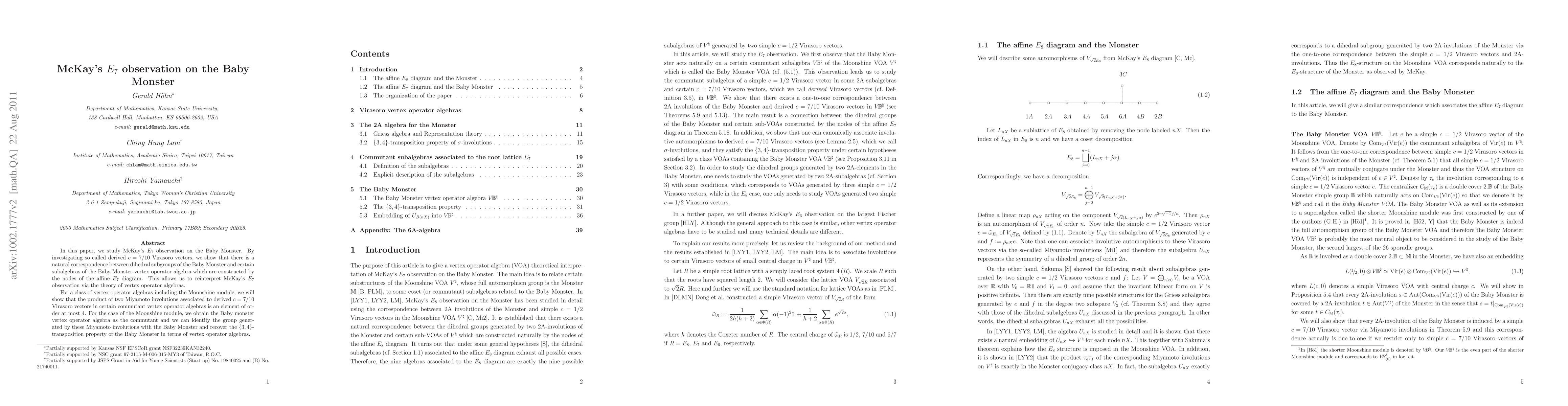 E7 part: In this paper, we study McKay's E7 observation on the Baby Monster. By investigating so called derived c=7/10 Virasoro vectors, we show that there is a natural correspondence between dihedral subgroups of the Baby Monster and certain subalgebras of the Baby Monster vertex operator algebra which are constructed by the nodes of the affine E7 diagram. This allows us to reinterpret McKay's E7 observation via the theory of vertex operator algebras. For a class of vertex operator algebras including the Moonshine module, we will show that the product of two Miyamoto involutions associated to derived c=7/10 Virasoro vectors in certain commutant vertex operator algebras is an element of order at most 4. For the case of the Moonshine module, we obtain the Baby monster vertex operator algebra as the commutant and we can identify the group generated by these Miyamoto involutions with the Baby Monster and recover the {3,4}-transposition property of the Baby Monster in terms of vertex operator algebras. E6 part: In this paper, we study McKay's E6-observation on the largest Fischer 3-transposition group Fi24. We investigate a vertex operator algebra VF of central charge 23+1/5 on which the Fischer group Fi24 naturally acts. We show that there is a natural correspondence between dihedral subgroups of Fi24 and certain vertex operator subalgebras constructed by the nodes of the affine E6 diagram by investigating so called derived Virasoro vectors of central charge 6/7. This allows us to reinterpret McKay's E6-observation via the theory of vertex operator algebras. It is also shown that the product of two non-commuting Miyamoto involutions of sigma-type associated to derived c=6/7 Virasoro vectors is an element of order 3, under certain general hypotheses on the vertex operator algebra. For the case of VF, we identify these involutions with the 3-transpositions of the Fischer group Fi24.