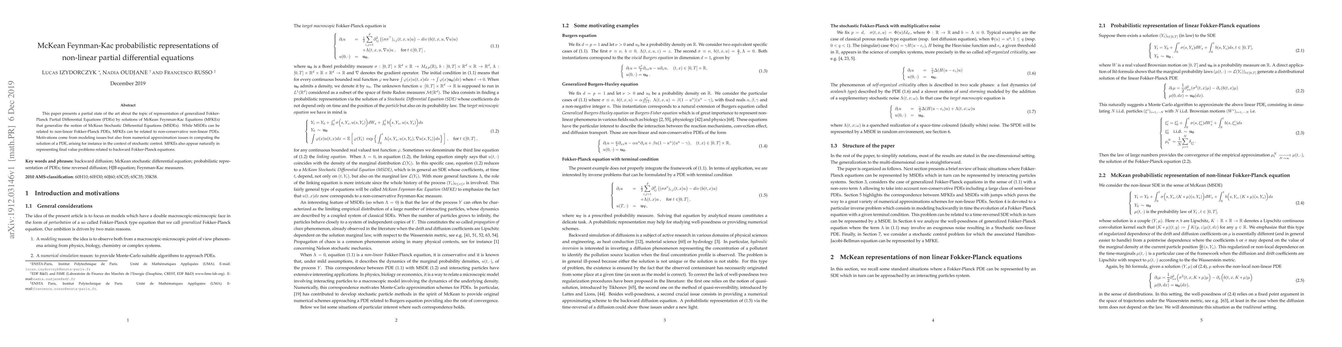 This paper presents a partial state of the art about the topic of representation of generalized Fokker-Planck Partial Differential Equations (PDEs) by solutions of McKean Feynman-Kac Equations (MFKEs) that generalize the notion of McKean Stochastic Differential Equations (MSDEs). While MSDEs can be related to non-linear Fokker-Planck PDEs, MFKEs can be related to non-conservative non-linear PDEs. Motivations come from modeling issues but also from numerical approximation issues in computing the solution of a PDE, arising for instance in the context of stochastic control. MFKEs also appear naturally in representing final value problems related to backward Fokker-Planck equations.