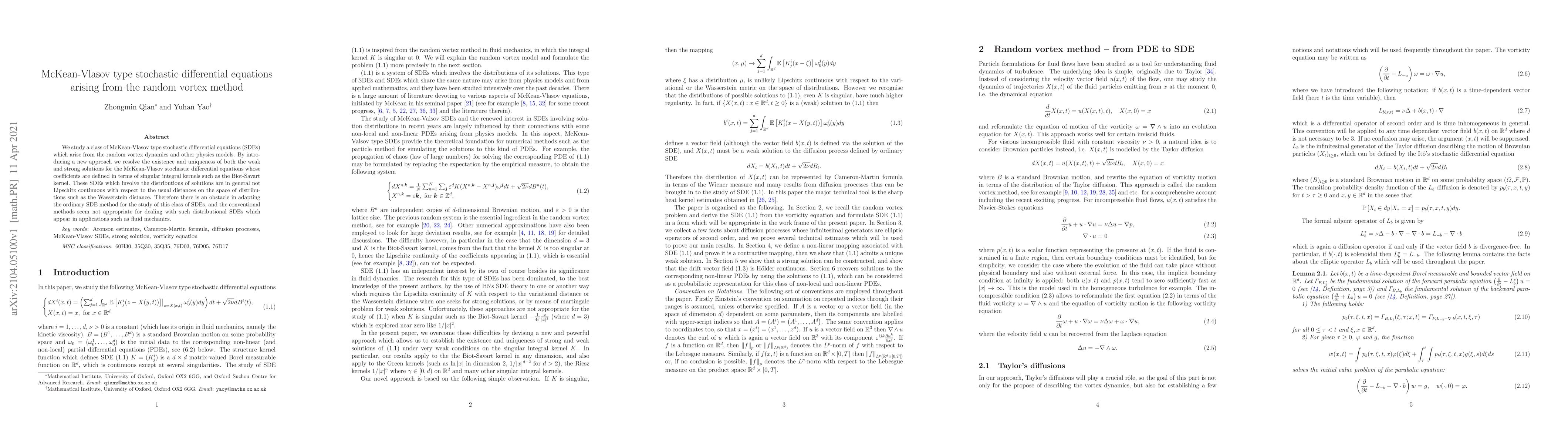 We study a class of McKean-Vlasov type stochastic differential equations (SDEs) which arise from the random vortex dynamics and other physics models. By introducing a new approach we resolve the existence and uniqueness of both the weak and strong solutions for the McKean-Vlasov stochastic differential equations whose coefficients are defined in terms of singular integral kernels such as the Biot-Savart kernel. These SDEs which involve the distributions of solutions are in general not Lipschitz continuous with respect to the usual distances on the space of distributions such as the Wasserstein distance. Therefore there is an obstacle in adapting the ordinary SDE method for the study of this class of SDEs, and the conventional methods seem not appropriate for dealing with such distributional SDEs which appear in applications such as fluid mechanics.