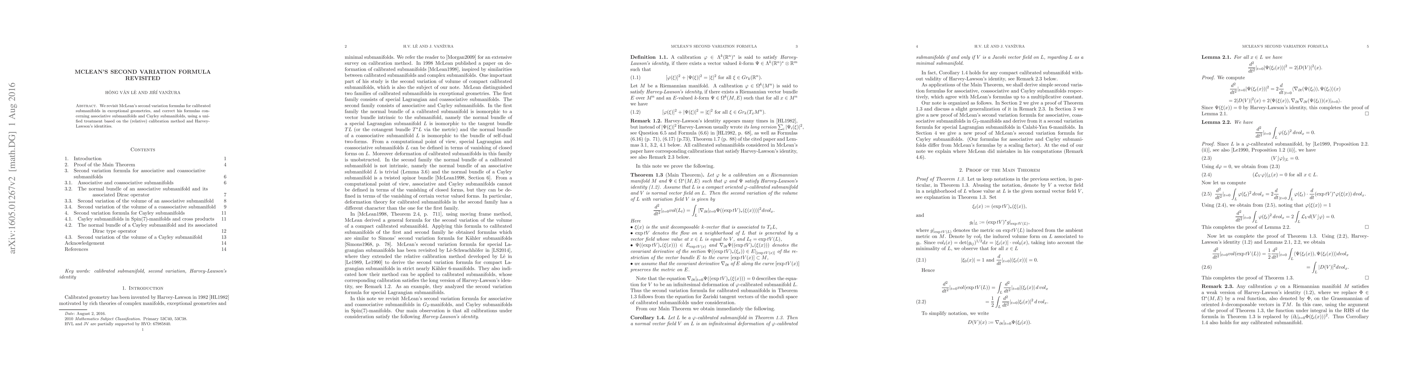 We revisit McLean's second variation formulas for calibrated submanifolds in exceptional geometries, and correct his formulas concerning associative submanifolds and Cayley submanifolds, using a unified treatment based on the (relative) calibration method and Harvey-Lawson's identities.